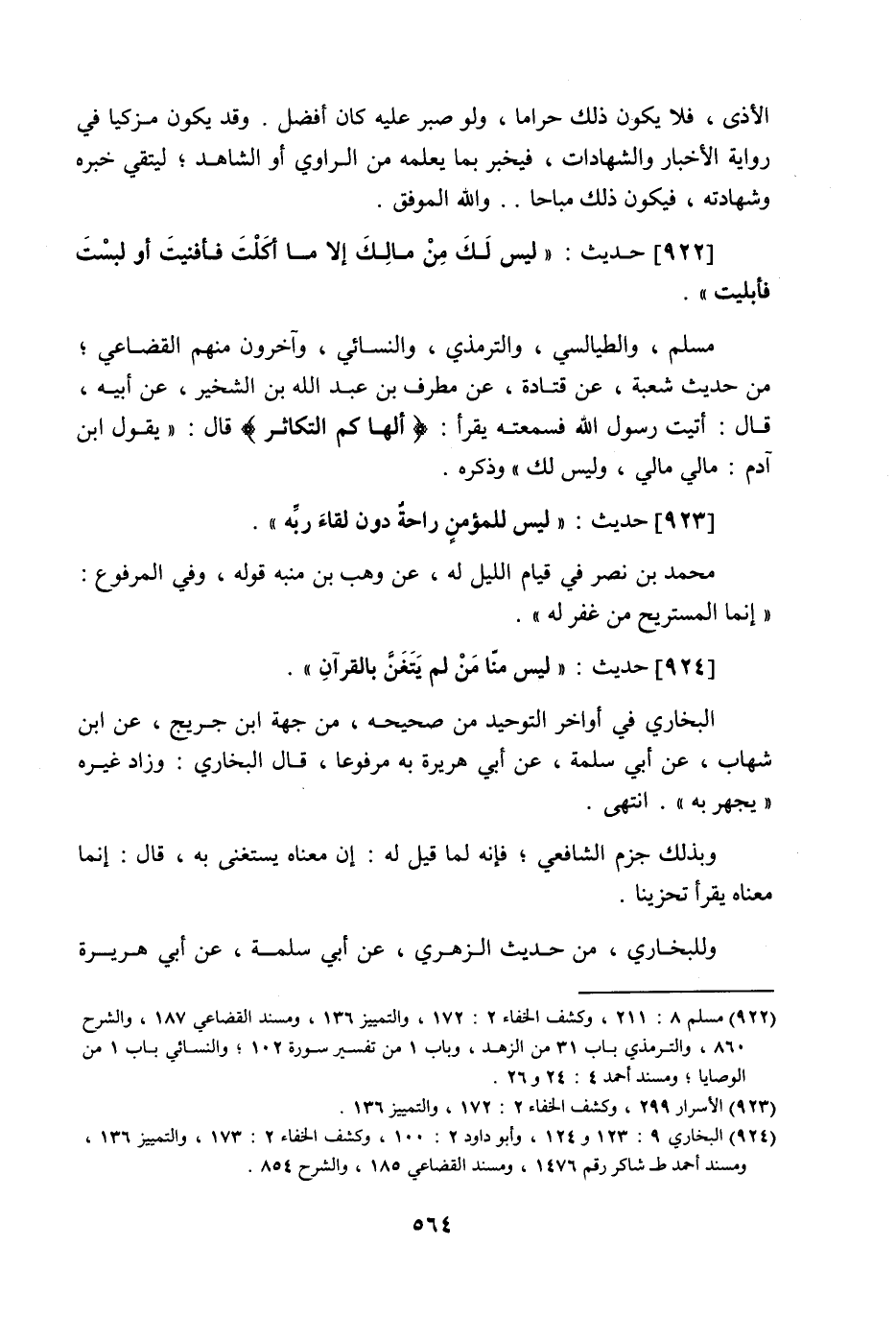 922 - حَدِيث: لَيْسَ لَكَ مِنْ مَالِكَ إِلا مَا أَكَلْتَ فَأَفْنَيْتَ أَوْ لَبِسْتَ فَأَبْلَيْتَ، مسلم والطيالسي والترمذي والنسائي وآخرون منهم القضاعي من حديث شعبة عن قتادة عن مطرف بن عبد اللَّه بن الشخير عن أبيه قال: أتيت رسول اللَّه صَلَّى اللَّهُ عَلَيْهِ وَسَلَّمَ فسمعته يقرأ {أَلْهَاكُمُ التَّكَاثُرُ} قال: يقول ابن آدم مالي مالي وليس لك. وذكره.