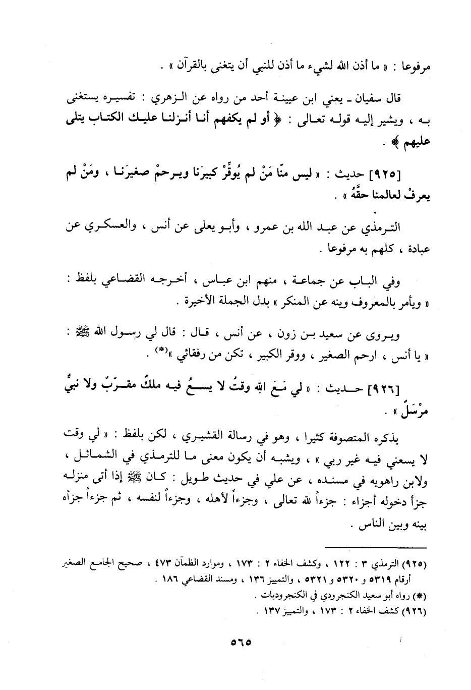 926 - حديث: لِي مَعَ اللَّه وَقْتٌ لا يَسَعُ فِيهِ مَلَكٌ مُقَرَّبٌ، وَلا نَبِيٌّ مُرْسَلٌ، يذكره المتصوفة كثيرا، وهو في رسالة القشيري لكن بلفظ: لي وقت لا يسعني فيه غير ربي، ويشبه أن يكون معنى ما للترمذي في الشمائل، ولابن راهويه في مسنده، عن علي في حديث طويل: كان صَلَّى اللَّهُ عَلَيْهِ وَسَلَّمَ إذا أتى منزله جزأ دخوله ثلاثة أجزاء: جزءا لله تعالى، وجزءا لأهله، وجزءا لنفسه، ثم جزأ جزأه بينه وبين الناس.