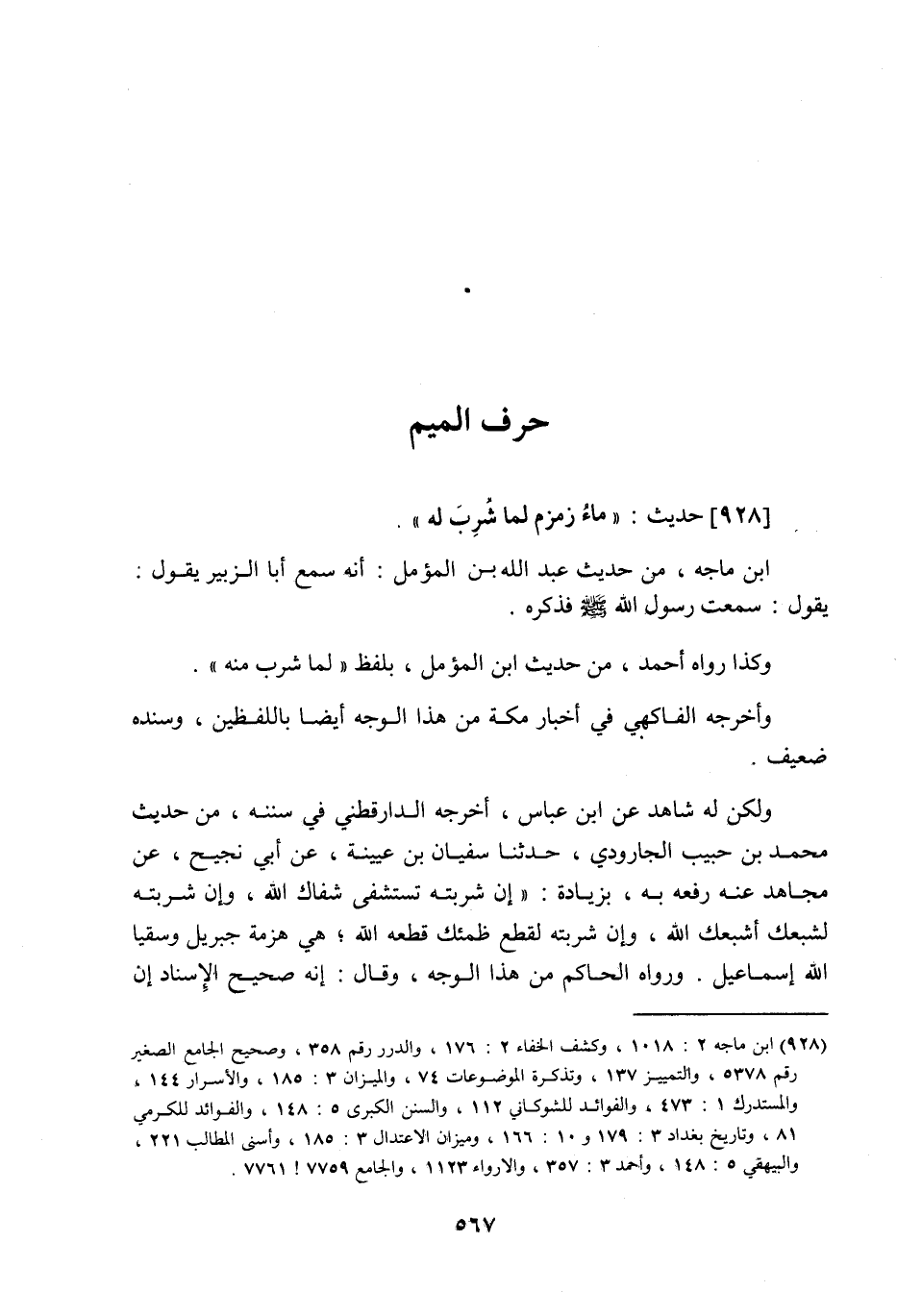 928 - حَدِيث: مَاءُ زَمْزَمَ لِمَا شُرِبَ لَهُ، ابن ماجه من حديث عبد اللَّه ابن المؤمل أنه سمع أبا الزبير يقول: سمعت جابرا يقول: سمعت رسول اللَّه صَلَّى اللَّهُ عَلَيْهِ وَسَلَّمَ، فذكره، وكذا رواه أحمد من حديث ابن المؤمل بلفظ: لما شرب منه، وأخرجه الفاكهي في أخبار مكة من هذا الوجه أيضا باللفظين، وسنده ضعيف، ولكن له شاهد عن ابن عباس أخرجه الدارقطني في سننه من حديث محمد بن حبيب الجارودي حدثنا سفيان بن عيينة عن أبي نجيح عن مجاهد عنه رفعه به بزيادة: إن شربته تستشفي شفاك اللَّه، وإن شربته لشبعك أشبعك اللَّه، وإن شربته لقطع ظمئك قطعه اللَّه هي هزمة جبريل وسقيا اللَّه إسماعيل، ورواه الحاكم من هذا الوجه وقال: إنه صحيح الإسناد إن