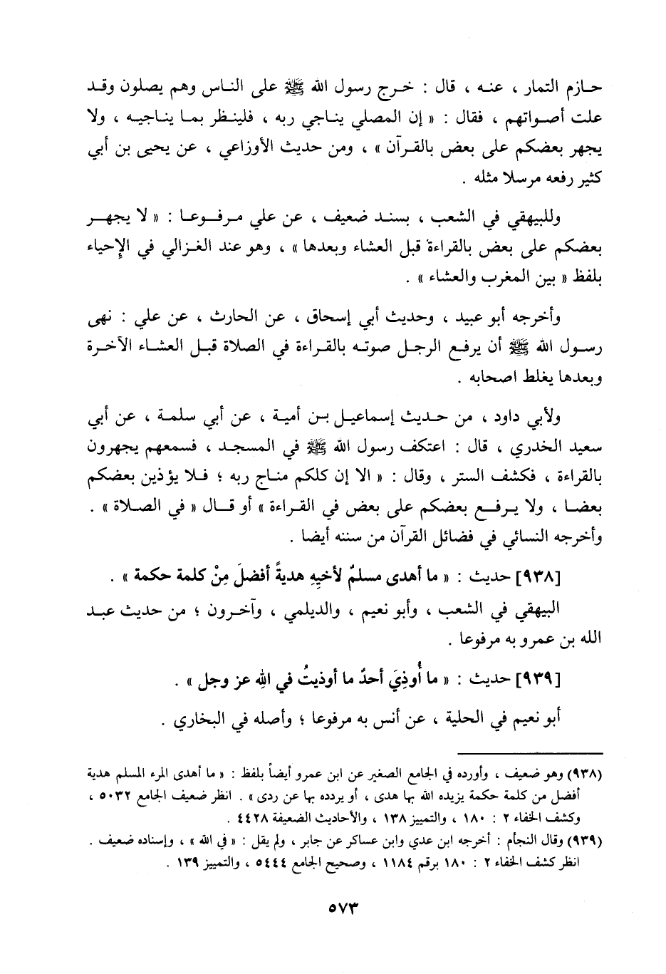 حازم التمار عنه قال: خرج رسول اللَّه صَلَّى اللَّهُ عَلَيْهِ وَسَلَّمَ على الناس وهم يصلون، وقد علت أصواتهم، فقال: إن المصلي يناجي ربه فلينظر بما يناجيه، ولا يجهر بعضكم على بعض بالقرآن، ومن حديث الأوزاعي عن يحيى بن أبي كثير رفعه مرسلا مثله، وللبيهقي في الشعب بسند ضعيف عن علي مرفوعا: لا يجهر بعضكم على بعض بالقراءة قبل العشاء وبعدها، وهو عند الغزالي في الإحياء بلفظ: بين المغرب والعشاء، وأخرجه أبو عبيد من حديث أبي إسحاق عن الحارث عن علي: نهى رسول اللَّه صَلَّى اللَّهُ عَلَيْهِ وَسَلَّمَ أن يرفع الرجل صوته بالقراءة في الصلاة قبل العشاء الآخرة وبعدها، يغلط أصحابه، ولأبي داود من حديث إسماعيل ابن أمية عن أبي سلمة عن أبي سعيد الخدري قال: اعتكف رسول اللَّه صَلَّى اللَّهُ عَلَيْهِ وَسَلَّمَ في المسجد فسمعهم يجهرون بالقراءة فكشف الستر وقال: ألا إن كلكم مناج ربه فلا يؤذين بعضكم بعضا ولا يرفع بعضكم على بعض في القراءة، أو قال: في الصلاة، وأخرجه النسائي في فضائل القرآن من سننه أيضا.