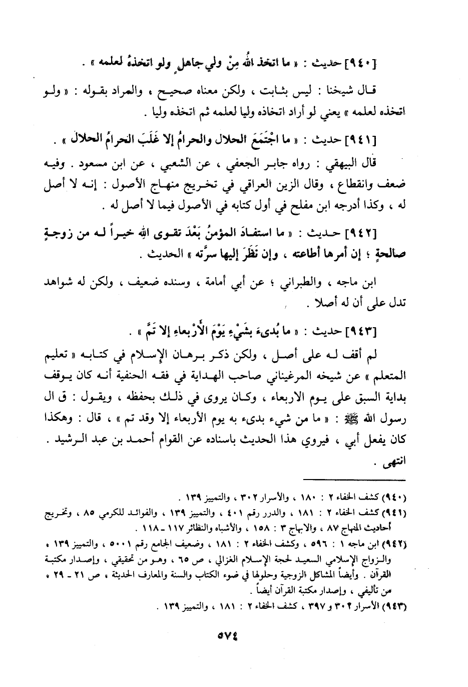 941 - حَدِيث: مَا اجْتَمَعَ الْحَلالُ وَالْحَرَامُ إِلا غَلَبَ الْحَرَامُ الْحَلالَ، قال البيهقي: رواه جابر الجعفي عن الشعبي عن ابن مسعود، وفيه ضعف وانقطاع، وقال الزين العراقي في تخريج منهاج الأصول: إنه لا أصل له، وكذا أدرجه ابن مفلح في أول كتابه في الأصول فيما لا أصل له.