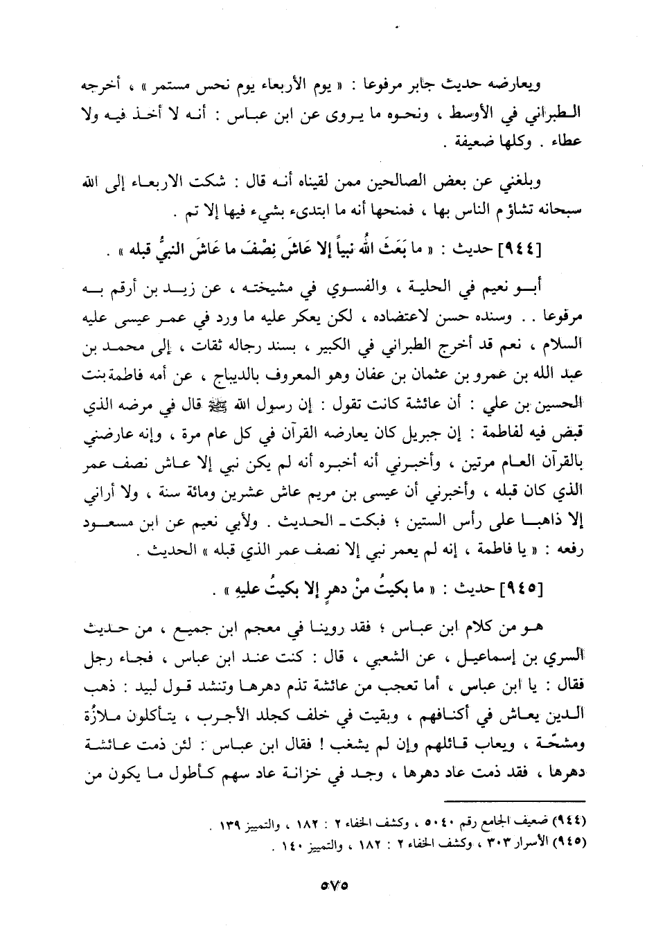 944 - حَدِيث: مَا بَعَثَ اللَّه نَبِيًّا إِلا عَاشَ نِصْفَ مَا عَاشَ النَّبِيُّ قَبْلَهُ، أبو نُعيم في الحلية، والفسوي في مشيخته عن زيد بن أرقم به مرفوعا، وسنده حسن لاعتضاده، لكن يعكر عليه ما ورد في عمر عيسى عليه السلام، نعم قد أخرج الطبراني في الكبير بسند رجاله ثقات إلى محمد بن عبد اللَّه بن عمرو بن عثمان بن عفان وهو المعروف بالديباج عن أمه فاطمة ابنة الحسين بن علي أن عائشة كانت تقول: إن رسول اللَّه صَلَّى اللَّهُ عَلَيْهِ وَسَلَّمَ قال في مرضه الذي قبض فيه لفاطمة: إن جبريل كان يعارضه القرآن في كل عام مرة، وإنه عارضني بالقرآن العام مرتين، وأخبرني أنه أخبره أنه لم يكن نبي إلا عاش نصف عمر الذي كان قبله، وأخبرني أن عيسى بن مريم عاش عشرين ومائة سنة، ولا أراني إلا على رأس الستين، فبكت (¬2) . الحديث. ولأبي نُعيم عن ابن مسعود رفعه: يا فاطمة، إنه لم يعمر نبي إلا نصف عمر الذي قبله. الحديث.