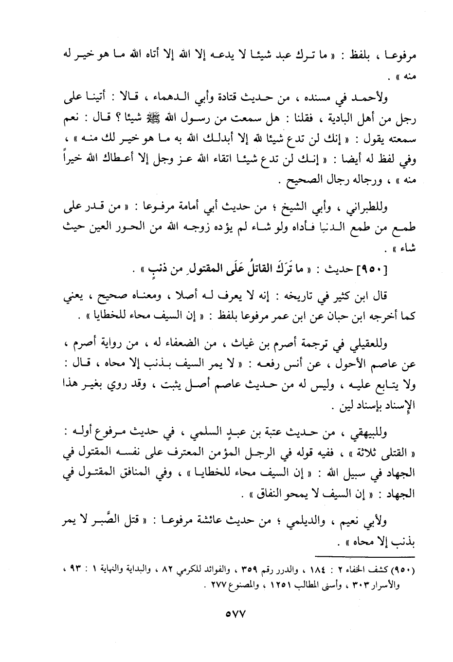 950 - حَدِيث: مَا تَرَكَ الْقَاتِلُ عَلَى الْمَقْتُولِ مِنْ ذَنْبٍ، قال ابن كثير في تاريخه: إنه لا يعرف له أصلا، ومعناه صحيح، يعني كما أخرجه ابن حبان عن ابن عمر مرفوعا بلفظ: إن السيف محاء للخطايا، وللعقيلي في ترجمة أصرم بن غياث من الضعفاء له من رواية أصرم عن عاصم الأحول عن أنس رفعه: لا يمر السيف بذنب إلا محاه، قال: ولا يتابع عليه، وليس له من حديث عاصم أصل يثبت، وقد روي بغير هذا الإسناد بإسناد لين، وللبيهقي من حديث عتبة بن عبد السلمي في حديث مرفوع، أوله: القتلى ثلاثة، ففيه قوله في الرجل المؤمن المعترف على نفسه المقتول في الجهاد في سبيل اللَّه: إن السيف محاء للخطايا، وفي المنافق المقتول في الجهاد: إن السيف لا يمحو النفاق، ولأبي نُعيم والديلمي من حديث عائشة مرفوعا: قتل الصِّبر لا يمر بذنب إلا محاه،