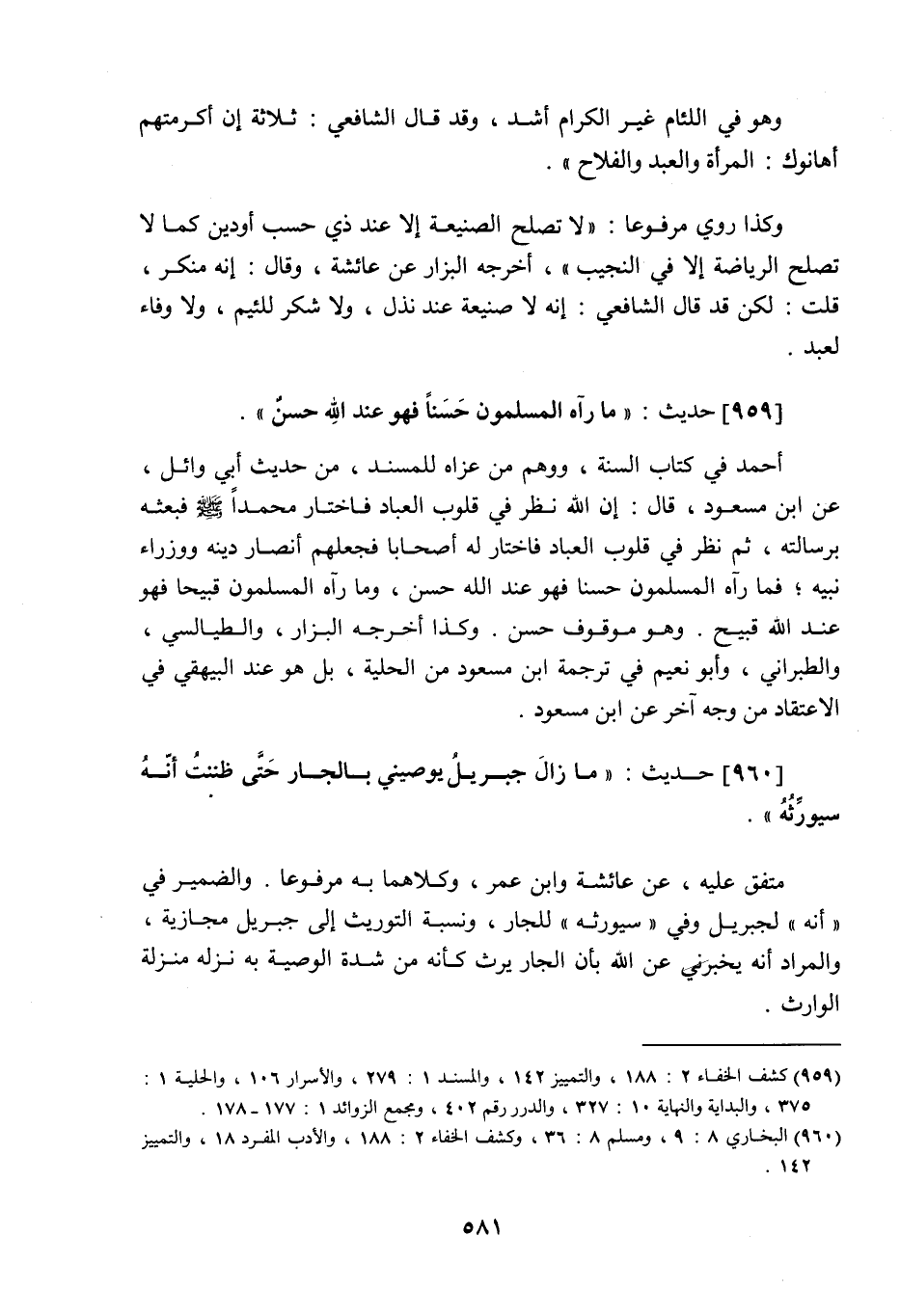 960 - حَدِيث: مَا زَالَ جِبْرِيلُ يُوصِينِي بِالْجَارِ حَتَّى ظَنَنْتُ أَنَّهُ سَيُوَرِّثُهُ، متفق عليه عن عائشة وابن عمر، وكلاهما به مرفوعا، والضمير في أنه لجبريل، وفي سيورثه للجار، ونسبة التوريث إلى جبريل مجازية، والمراد أنه يخبرني عن اللَّه، بأن الجار يرث كأنه من شدة الوصية به نزله منزلة الوارث.