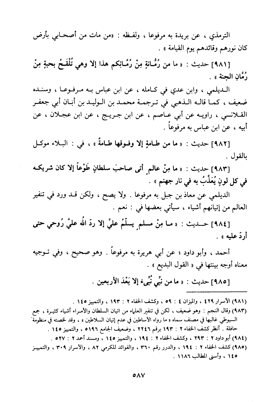 984 - حَدِيث: مَا مِنْ مُسْلِمٍ يُسَلِّمُ عَلَيَّ إِلا رَدَّ اللَّه عَلَيَّ رُوحِي حَتَّى أَرُدَّ عَلَيْهِ، أحمد وأبو داود عن أبي هريرة به مرفوعا، وهو صحيح، وفي توجيه معناه أوجه بينتها في القول البديع.