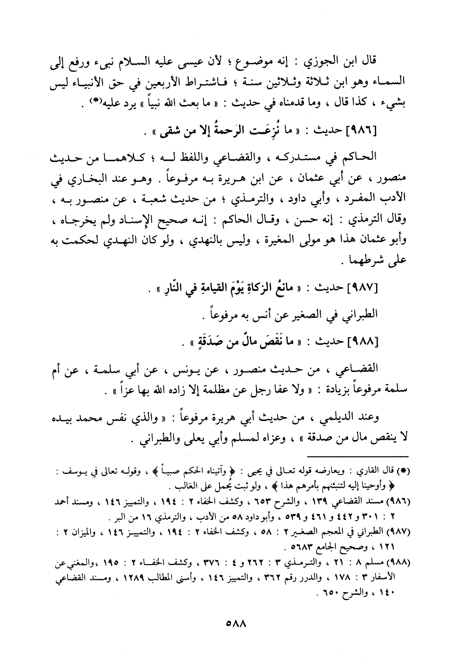 986 - حَدِيث: مَا نُزِعَتِ الرَّحْمَةُ إِلا مِنْ شَقِيٍّ، الحاكم في مستدركه، والقضاعي واللفظ له، كلاهما من حديث منصور عن أبي عثمان عن أبي هريرة به مرفوعا، وهو عند البخاري في الأدب المفرد، وأبي داود، والترمذي، من حديث شعبة عن منصور به، وقال الترمذي: إنه حسن، وقال الحاكم: إنه صحيح الإسناد ولم يخرجاه، وأبو عثمان هذا هو مولى المغيرة، وليس بالنهدي، ولو كان النهدي لحكمت به على شرطهما.