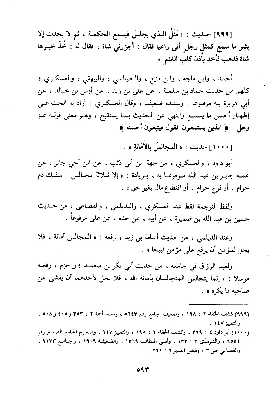 1000 - حَدِيث: الْمَجَالِسُ بِالأَمَانَةِ، أبو داود والعسكري من جهة ابن أبي ذيب عن ابن أخي جابر عن عمه جابر بن عبد اللَّه مرفوعا به بزيادة: إلا ثلاثة مجالس: سفك دم حرام، أو فرج حرام، أو اقتطاع مال بغير حق، ولفظ الترجمة فقط عند العسكري والديلمي والقضاعي من حديث حسين بن عبد اللَّه بن ضميرة عن أبيه عن جده عن علي مرفوعا، وعند الديلمي من حديث أسامة بن زيد رفعه: المجالس أمانة، فلا يحل لمؤمن أن يرفع على مؤمن قبيحا، ولعبد الرزاق في جامعه من حديث أبي بكر بن محمد بن حزم رفعه مرسلا: إنما يتجالس المتجالسان بأمانة اللَّه، فلا يحل لأحدهما أن يفشي عن صاحبه ما يكره،