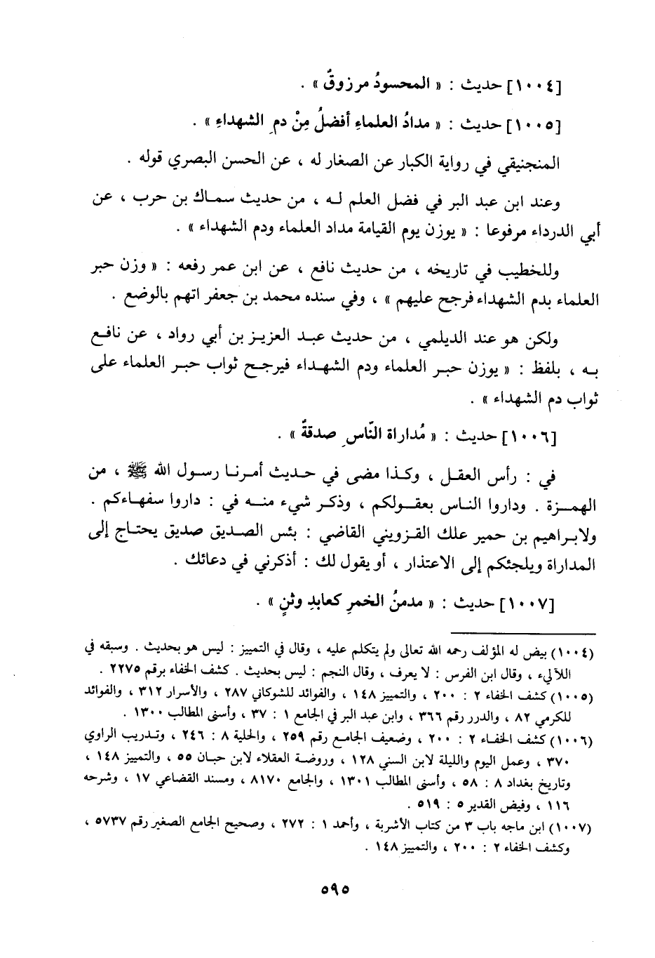 1005 - حَدِيث: مِدَادُ الْعُلَمَاءِ أَفْضَلُ مِنْ دَمِ الشُّهَدَاءِ، المنجنيقي في رواية الكبار عن الصغار له عن الحسن البصري قوله، وعند ابن عبد البر في فضل العلم له من حديث سماك بن حرب عن أبي الدرداء مرفوعا: يوزن يوم القيامة مداد العلماء ودم الشهداء، وللخطيب في تاريخه من حديث نافع عن ابن عمر رفعه: وزن حبر العلماء بدم الشهداء فرجح عليهم، وفي سنده محمد بن جعفر اتهم بالوضع، ولكن هو عند الديلمي من حديث عبد العزيز بن أبي رواد عن نافع به بلفظ: يوزن حبر العلماء ودم الشهداء فيرجح ثواب حبر العلماء على ثواب دم الشهداء.