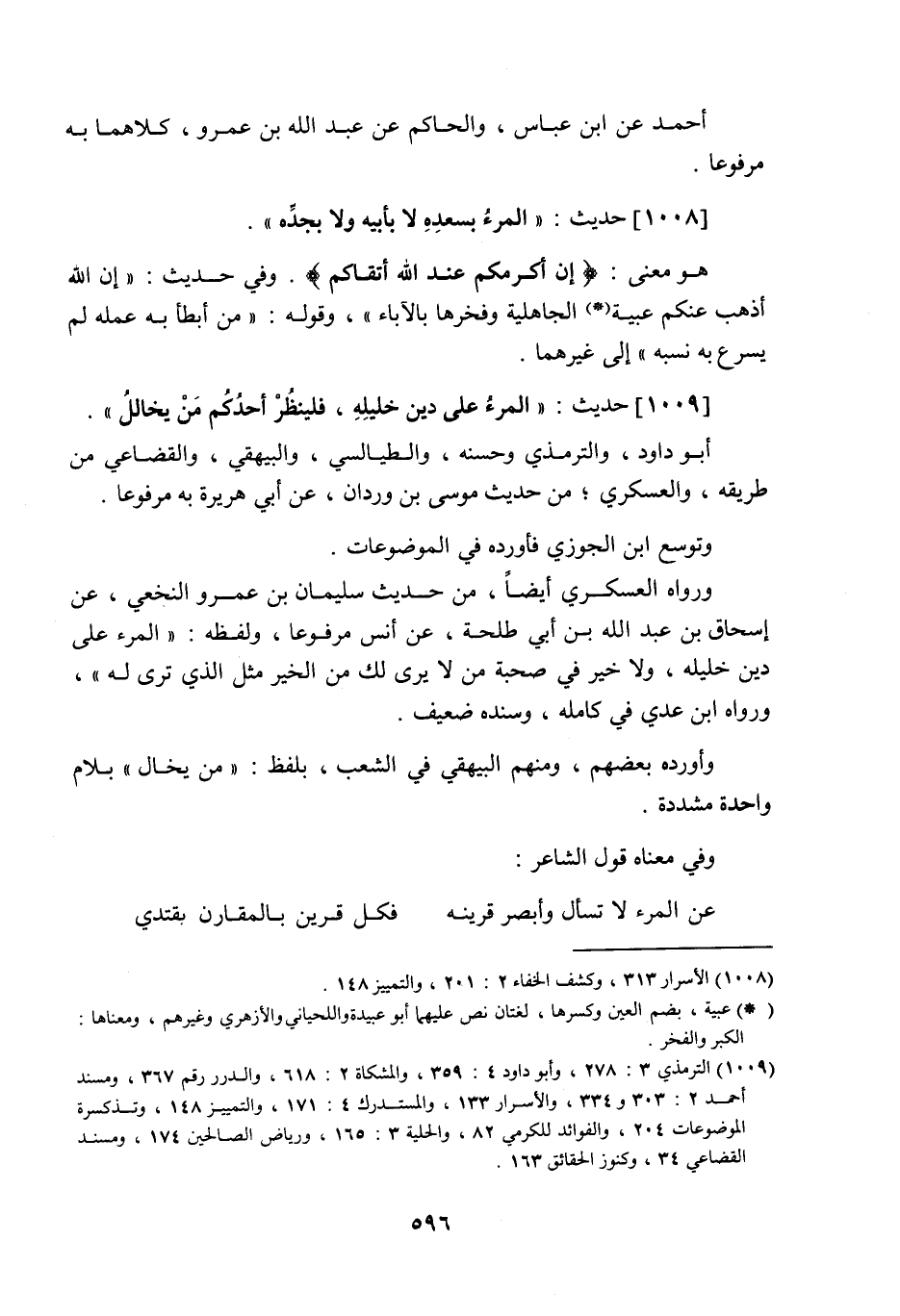 1009 - حَدِيث: الْمَرْءُ عَلَى دِينِ خَلِيلِهِ، فَلْيَنْظُرْ أَحَدُكُمْ مَنْ يُخَالِلُ، أبو داود والترمذي وحسنه، والطيالسي والبيهقي والقضاعي من طريقه، والعسكري من حديث موسى بن وردان عن أبي هريرة به مرفوعا، وتوسع ابن الجوزي فأورده في الموضوعات، ورواه العسكري أيضا من حديث سليمان بن عمرو النخعي عن إسحاق بن عبد اللَّه بن أبي طلحة عن أنس مرفوعا، ولفظه: المرء على دين خليله، ولا خير في صحبة من لا يرى لك من الخير مثل الذي ترى له، ورواه ابن عدي في كامله، وسنده ضعيف، وأورده بعضهم ومنهم البيهقي في الشعب، بلفظ: من يخال بلام واحدة مشددة، وفي معناه قول الشاعر: