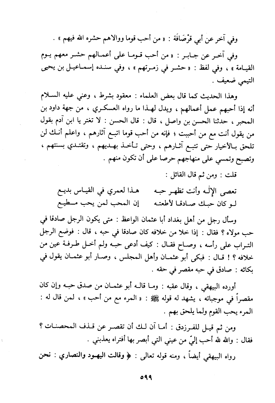 وسأل رجل من أهل بغداد أبا عثمان الواعظ: متى يكون الرجل صادقا في حب مولاه؟ فقال: إذا خلا من خلافه كان صادقا في حبه، قال: فوضع الرجل التراب على رأسه وصاح فقال: كيف أدعي حبه ولم أخل طرفة عين من خلافه، قال: فبكى أبو عثمان وأهل المجلس، وصار أبو عثمان يقول في بكائه: صادق في حبه مقصر في حقه، أورده البيهقي وقال عقبه: وما قاله أبو عثمان من صدق حبه وإن كان مقصرا في موجباته يشهد له قوله صَلَّى اللَّهُ عَلَيْهِ وَسَلَّمَ: المرء مع من أحب، لمن قال له المرء يحب القوم ولم يلحق بهم، ومن ثم لما قيل للفرزدق: أما آن لك أن تقصر عن قذف المحصنات، فقال: واللَّه للَّه أحب إلي من عيني التي أبصر بها، أفتراه يعذبني، ورواه البيهقي أيضا، ومنه قوله تعالى {وَقَالَتِ الْيَهُودُ وَالنَّصَارَى نَحْنُ