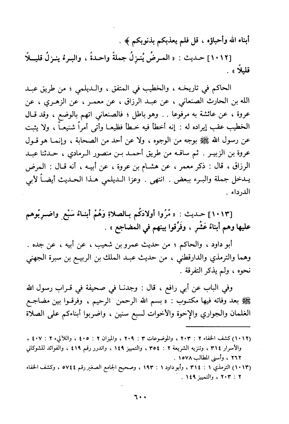 1013 - حَدِيث: مُرُوا أَوْلادَكُمْ بِالصَّلاةِ وَهُمْ أَبْنَاءُ سَبْعِ سِنِينَ وَاضْرِبُوهُمْ عَلَيْهَا وَهُمْ أَبْنَاءُ عَشْرٍ وَفَرِّقُوا بَيْنَهُمْ فِي الْمَضَاجِعِ، أبو داود والحاكم من حديث عمرو بن شعيب عن أبيه عن جده، وهما والترمذي والدارقطني من حديث عبد الملك بن الربيع بن سبرة الجهني نحوه، ولم يذكر التفرقة، وفي الباب عن أبي رافع قال: وجدنا في صحيفة في قراب رسول اللَّه صَلَّى اللَّهُ عَلَيْهِ وَسَلَّمَ بعد وفاته فيها مكتوب بسم اللَّه الرحمن الرحيم وفرقوا بين مضاجع الغلمان والجواري والأخوة والأخوات لسبع سنين، واضربوا أبناءكم على الصلاة