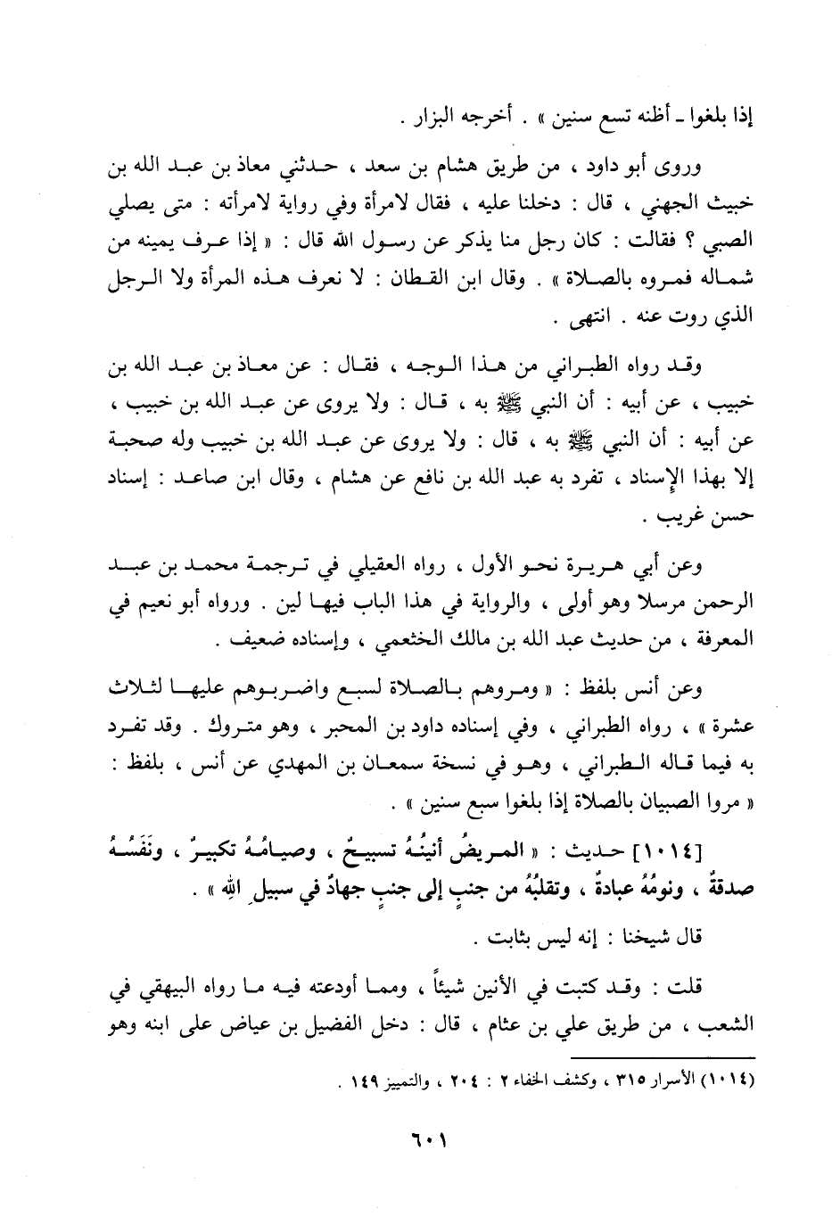 إذا بلغوا أظنه تسع سنين، أخرجه البزار. وروى أبو داود من طريق هشام بن سعد حدثني معاذ بن عبد اللَّه بن خبيب الجهني قال: دخلنا عليه فقال لامرأة وفي رواية لامرأته: متى يصلي الصبي؟ فقالت: كان رجل منا يذكر عن رسول اللَّه صَلَّى اللَّهُ عَلَيْهِ وَسَلَّمَ قال: إذا عرف يمينه من شماله فمروه بالصلاة، وقال ابن القطان: لا نعرف هذه المرأة ولا الرجل الذي روت عنه، انتهى. وقد رواه الطبراني من هذا الوجه فقال: عن معاذ بن عبد اللَّه بن خبيب عن أبيه أن النبي صَلَّى اللَّهُ عَلَيْهِ وَسَلَّمَ به، قال: ولا يروى عن عبد اللَّه بن خبيب وله صحبة إلا بهذا الإسناد، تفرد به عبد اللَّه بن نافع عن هشام، وقال ابن صاعد: إسناد حسن غريب، وعن أبي هريرة نحو الأول رواه العقيلي في ترجمة محمد بن الحسن بن عطية العوفي عن محمد بن عبد الرحمن عنه، قال: وروي عن محمد بن عبد الرحمن مرسلا، وهو أولى، والرواية في هذا الباب فيها لين، ورواه أبو نُعيم في المعرفة من حديث عبد اللَّه بن مالك الخثعمي وإسناده ضعيف وعن أنس بلفظ: ومروهم بالصلاة لسبع واضربوهم عليها لثلاث عشرة، رواه الطبراني وفي إسناده داود بن المحبر وهو متروك، وقد تفرد به فيما قاله الطبراني، وهو في نسخة سمعان ابن المهدي عن أنس بلفظ: مروا الصبيان بالصلاة إذا بلغوا سبع سنين.