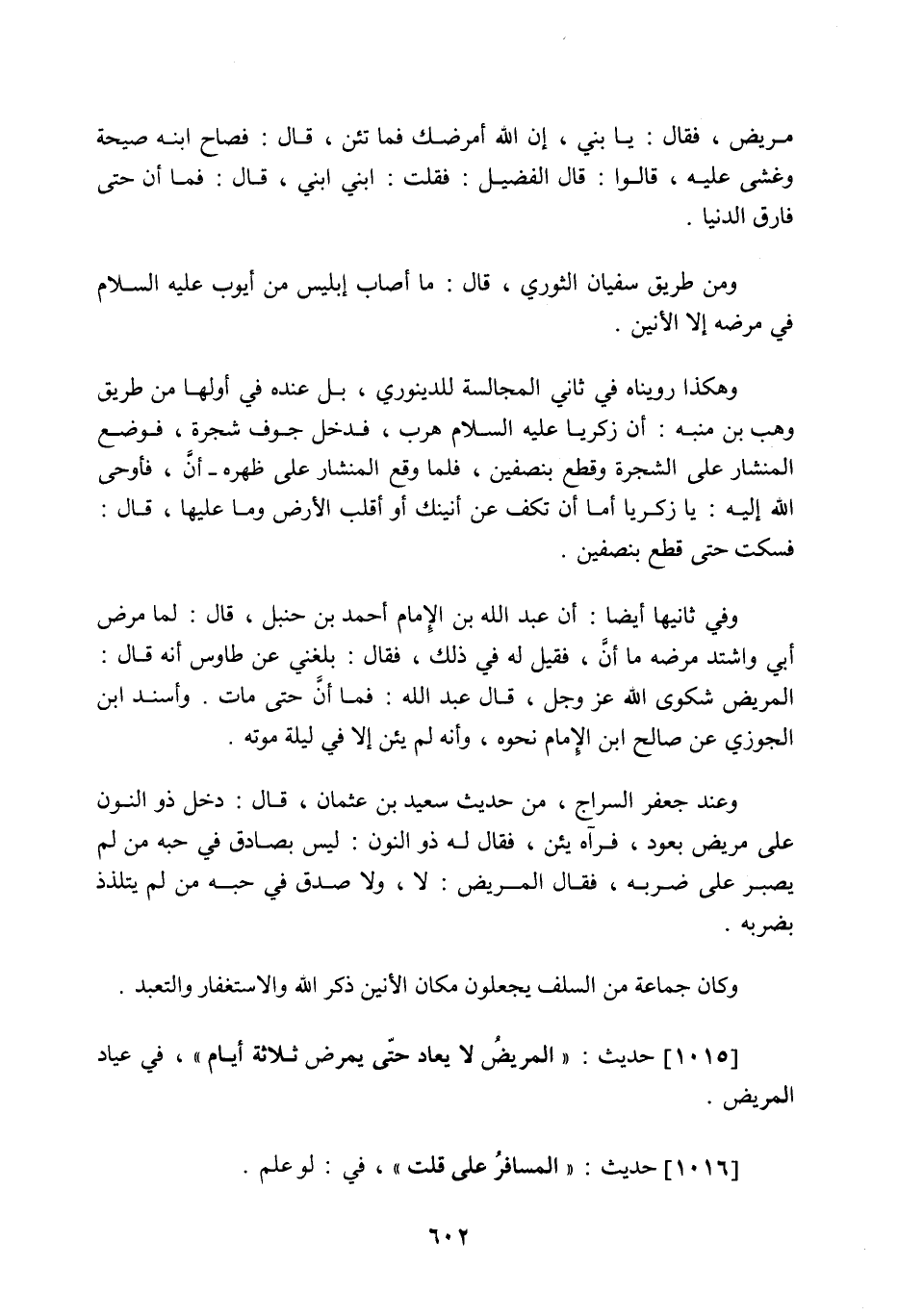 مريض فقال: يا بني إن اللَّه أمرضك فما تئن قال: فصاح ابنه صيحة وغشي عليه، قالوا: قال الفضيل: فقلت ابني ابني قال: فما أن حتى فارق الدنيا، ومن طريق سفيان الثوري قال: ما أصاب إبليس من أيوب عليه السلام في مرضه إلا الأنين، وهكذا رويناه في ثاني المجالسة للدينوري، بل عنده في أولها من طريق وهب بن منبه أن زكريا عليه السلام هرب فدخل جوف شجرة فوضع المنشار على الشجرة وقطع بنصفين فلما وقع المنشار على ظهره أن، فأوحى اللَّه إليه يا زكريا إما أن تكف عن أنينك أو أقلب الأرض وما عليها، قال: فسكت حتى قطع بنصفين، وفي ثانيها أيضا أن عبد اللَّه بن الإمام أحمد بن حنبل قال: لما مرض أبي واشتد مرضه ما أن، فقيل له في ذلك فقال: بلغني عن طاوس أنه قال: [أنين] المريض شكوى اللَّه عز وجل، قال عبد اللَّه: فما أن حتى مات، وأسند ابن الجوزي عن صالح ابن الإمام نحوه، وأنه لم يئن إلا في ليلة موته، وعند جعفر السراج من حديث سعيد بن عثمان قال: دخل ذو النون على مريض يعوده فرآه يئن، فقال له ذو النون: ليس بصادق في حبه من لم يصبر على ضربه، فقال المريض: لا ولا صدق في حبه من لم يتلذذ بضربه، وكان جماعة من السلف يجعلون مكان الأنين ذكر اللَّه والاستغفار والتعبد (¬1) .