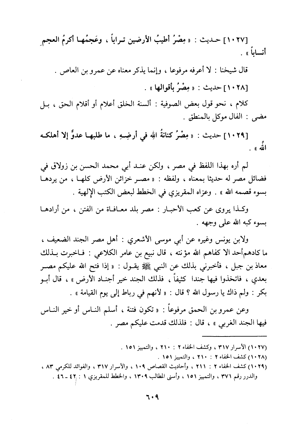 1029 - حَدِيث: مِصْرُ كِنَانَةُ اللَّه فِي أَرْضِهِ، مَا طَلَبَهَا عَدُوٌّ إِلا أَهْلَكَهُ اللَّه، لم أره بهذا اللفظ في مصر ولكن عند أبي محمد الحسن بن زولاق في فضائل مصر له حديثا بمعناه ولفظه: مصر خزائن الأرض كلها من يردها بسوء قصمه اللَّه، وعزاه المقريزي في الخطط لبعض الكتب الإلهية، وكذا يروى عن كعب الأحبار: مصر بلد معافاة من الفتن من أرادها بسوء كبه اللَّه على وجهه، ولابن يونس وغيره عن أبي موسى الأشعري: أهل مصر الجند الضعيف، ما كادهم أحد إلا كفاهم اللَّه مؤونته. قال نبيع بن عامر الكلاعي: فأخبرت بذلك معاذ بن جبل فأخبرني بذلك عن النبي صَلَّى اللَّهُ عَلَيْهِ وَسَلَّمَ، وعن عمرو بن العاص حدثني عمر أنه سمع رسول اللَّه صَلَّى اللَّهُ عَلَيْهِ وَسَلَّمَ يقول: إذا فتح اللَّه عليكم مصر بعدي فاتخذوا فيها جندا كثيفا، فذلك الجند خير أجناد الأرض، قال أبو بكر: ولم ذاك يا رسول اللَّه؟ قال: لأنهم في رباط إلى يوم القيامة، وعن عمرو بن الحمق مرفوعا: تكون فتنة أسلم الناس فيها أو خير الناس فيها الجند الغربي، قال: فلذلك قدمت عليكم مصر،