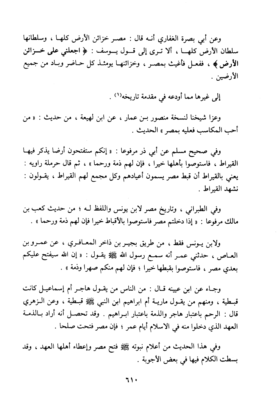 وعن أبي بصرة الغفاري أنه قال: مصر خزائن الأرض كلها، وسلطانها سلطان الأرض كلها، ألا ترى إلى قول يوسف {اجْعَلْنِي عَلَى خَزَائِنِ الأَرْضِ} ، ففعل فأغيث بمصر، وخزائنها يومئذ كل حاضر وباد من جميع الأرضين، إلى غيرها مما أودعه في مقدمة تاريخه (¬1) ، وعزا شيخنا لنسخة منصور ابن عمار عن ابن لهيعة من حديث: من أحب المكاسب فعليه بمصر، الحديث. وفي صحيح مسلم عن أبي ذر مرفوعا: إنكم ستفتحون أرضا يذكر فيها القيراط فاستوصوا بأهلها خيرا فإن لهم ذمة ورحما، ثم قال حرملة راويه: يعني بالقيراط أن قبط مصر يسمون أعيادهم وكل مجمع لهم القيراط، وفي الطبراني وتاريخ مصر لابن يونس واللفظ له من حديث كعب بن مالك مرفوعا: إذا دخلتم مصر فاستوصوا بالأقباط خيرا فإن لهم ذمة ورحما، ولابن يونس فقط من طريق بحير بن ذاخر المعافري عن عمرو بن العاص حدثني عمر أنه سمع رسول اللَّه صَلَّى اللَّهُ عَلَيْهِ وَسَلَّمَ يقول: إن اللَّه سيفتح عليكم بعدي مصر فاستوصوا بقبطها خيرا فإن لهم منكم صهرا وذمة، وجاء عن ابن عيينة قال: من الناس من يقول هاجر أم إسماعيل كانت قبطية ومنهم من يقول مارية أم إبراهيم ابن النبي صَلَّى اللَّهُ عَلَيْهِ وَسَلَّمَ قبطية، وعن الزهري قال: الرحم باعتبار هاجر والذمة باعتبار إبراهيم، وقد تحصل أنه أراد بالذمة العهد الذي دخلوا منه في الإسلام أيام عمر فإن مصر فتحت صلحا، وفي هذا الحديث من أعلام نبوته صَلَّى اللَّهُ عَلَيْهِ وَسَلَّمَ فتح مصر وإعطاء أهلها العهد، وقد بسطت الكلام فيه في بعض الأجوبة.
