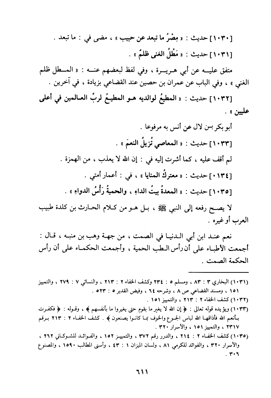 1035 - حَدِيث: الْمَعِدَةُ بَيْتُ الدَّاءِ، وَالْحِمْيَةُ رَأْسُ الدَّوَاءِ، لا يصح رفعه إلى النبي صَلَّى اللَّهُ عَلَيْهِ وَسَلَّمَ، بل هو من كلام الحارث بن كلدة طبيب العرب أو غيره، نعم عند ابن أبي الدنيا في الصمت من جهة وهب بن منبه قال: أجمعت الأطباء على أن رأس الطب الحمية، وأجمعت الحكماء على أن رأس الحكمة الصمت،