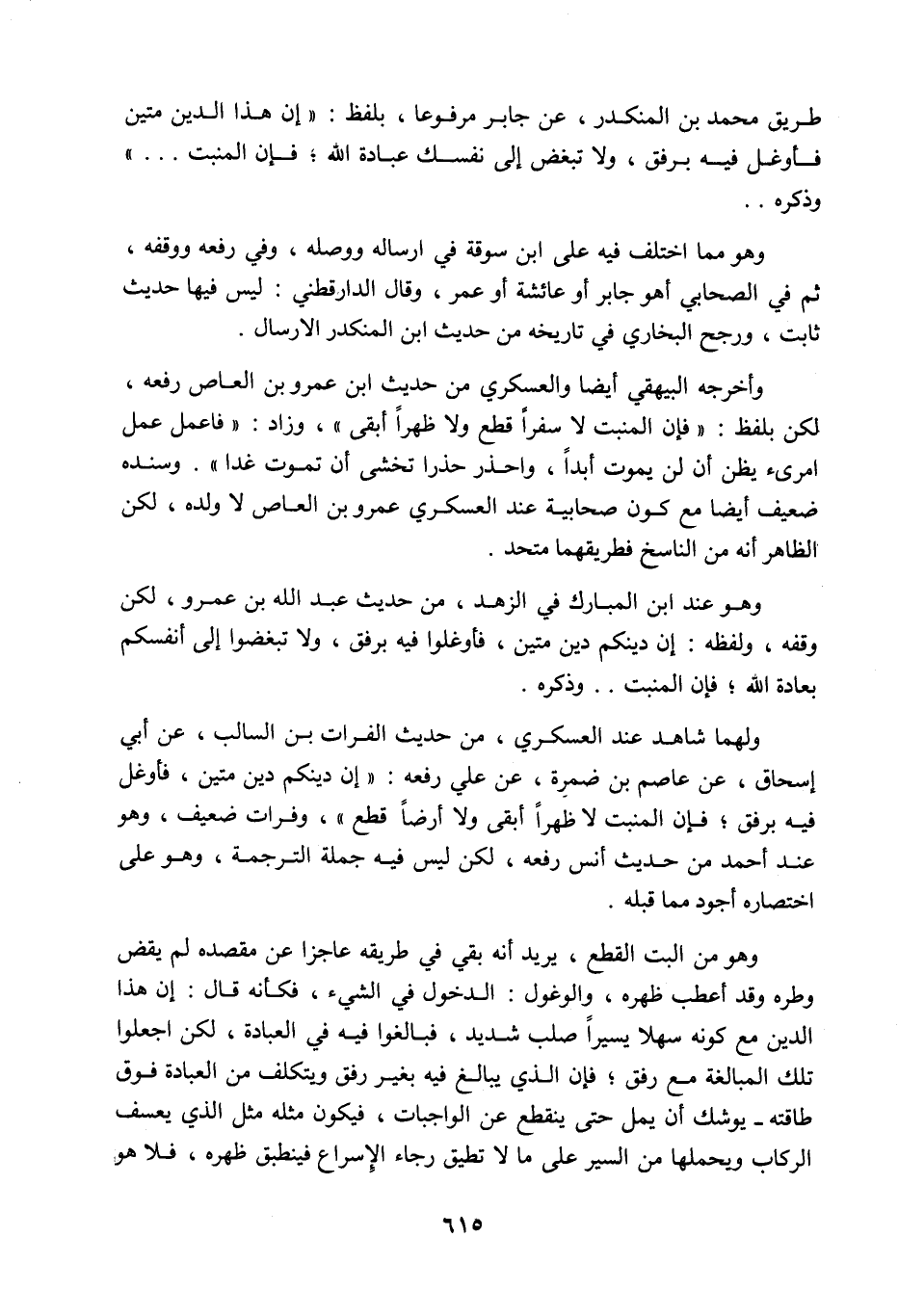 طريق محمد بن المنكدر عن جابر مرفوعا بلفظ: إن هذا الدين متين فأوغل فيه برفق ولا تبغض إلى نفسك عبادة اللَّه، فإن المنبت، وذكره، وهو مما اختلف فيه على ابن سوقة في إرساله ووصله، وفي رفعه ووقفه، ثم في الصحابي، أهو جابر أو عائشة أو عمر، وقال الدارقطني: ليس فيها حديث ثابت، ورجح البخاري في تاريخه من حديث ابن المنكدر الإرسال، وأخرجه البيهقي أيضا، والعسكري من حديث ابن عمرو بن العاص رفعه لكن بلفظ: فإن المنبت لا سفرا قطع ولا ظهرا أبقى، وزاد: فاعمل عمل امرئ يظن أن لن يموت أبدا، واحذر حذرا تخشى أن تموت غدا (¬1) ، وسنده ضعيف أيضا، مع كون صحابيه عند العسكري عمرو بن العاص لا ولده، لكن الظاهر أنه من الناسخ فطريقهما متحد، وهو عند ابن المبارك في الزهد من حديث عبد اللَّه بن عمرو لكن وقفه ولفظه: إن دينكم دين متين فأوغلوا فيه برفق، ولا تبغضوا إلى أنفسكم عبادة اللَّه، فإن المنبت، وذكره. ولهما شاهد عند العسكري من حديث الفرات بن السالب عن أبي إسحاق عن عاصم بن ضمرة عن علي رفعه: إن دينكم دين متين فأوغل فيه برفق، فإن المنبت لا ظهرا أبقى ولا أرضا قطع، وفرات ضعيف، وهو عند أحمد من حديث أنس رفعه، لكن ليس فيه جملة الترجمة، وهو على اختصاره أجود مما قبله، وهو من البت القطع يريد أنه بقى في طريقه عاجزا عن مقصده لم يقض وطره، وقد أعطب ظهره، والوغول الدخول في الشيء، فكأنه قال إن هذا الدين مع كونه سهلا يسيرا صلب شديد فبالغوا فيه في العبادة، لكن اجعلوا تلك المبالغة مع رفق، فإن الذي يبالغ فيه بغير رفق ويتكلف من العبادة فوق طاقته يوشك أن يمل حتى ينقطع عن الواجبات، فيكون مثله مثل الذي يعسف الركاب ويحملها من السير على ما لا تطيق رجاء الإسراع فينطبق ظهره فلا هو