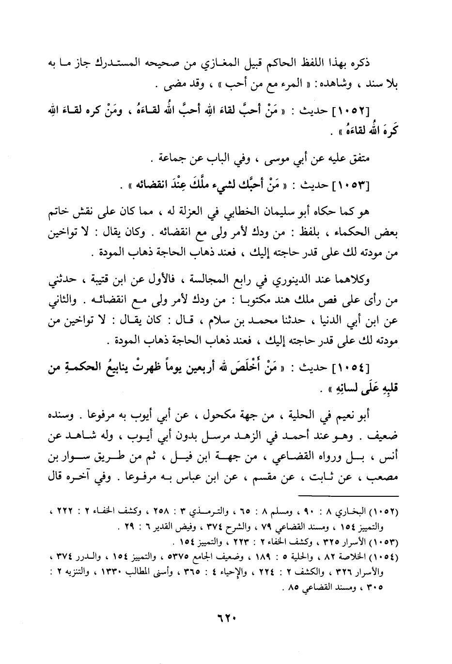 1053 - حَدِيث: مَنْ أَحَبَّكَ لِشَيْءٍ هَلَكَ عِنْدَ انْقِضَائِهِ، هو كما حكاه أبو سليمان الخطابي في العزلة له مما كان على نقش خاتم بعض الحكماء، بلفظ: من ودك لأمر ولى عند انقضائه، وكان يقال: لا تواخين من مودته لك على قدر حاجته إليك، فعند ذهاب الحاجة ذهاب المودة، وكلاهما عند الدينوري في رابع المجالسة، فالأول عن ابن قتيبة حدثني من رأى على فص ملك الهند مكتوبا: من ودك لأمر ولى عند انقضائه، والثاني عن ابن أبي الدنيا حدثنا محمد بن سلام قال: كان يقال: لا ترجين من مودته لك على قدر حاجته إليك فعند ذهاب الحاجة ذهاب المودة.
