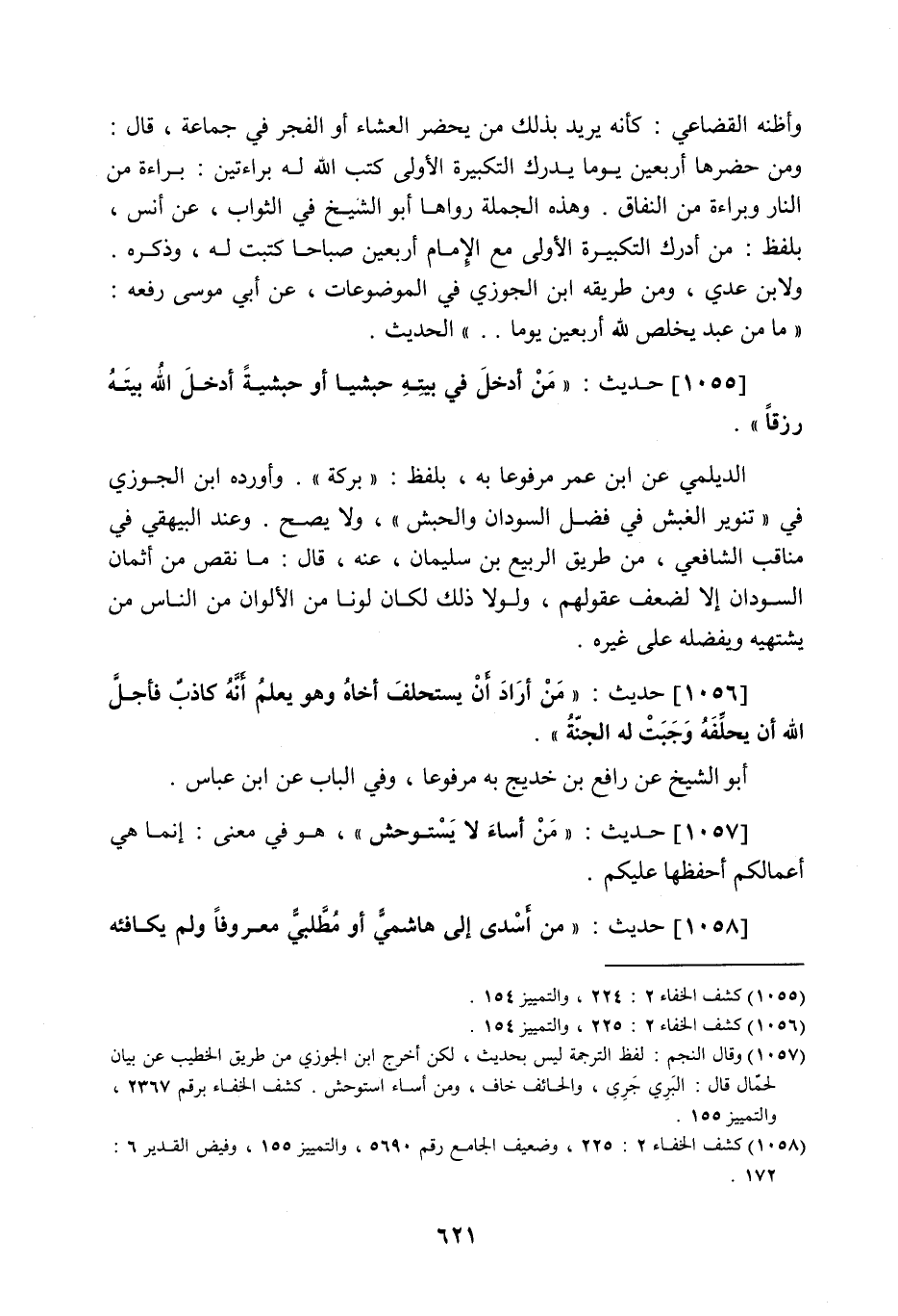 1055 - حَدِيث: مَنْ أَدْخَلَ فِي بَيْتِهِ حَبَشِيًّا أَوْ حَبَشِيَّةً أَدْخَلَ اللَّه بَيْتَهُ رِزْقًا، الديلمي عن ابن عمر مرفوعا به، بلفظ: بركة، وأورده ابن الجوزي في "تنوير الغبش في فضل السودان والحبش" ولا يصح، وعند البيهقي في مناقب الشافعي من طريق الربيع بن سليمان عنه قال: ما نقص من أثمان السودان إلا لضعف عقولهم، ولولا ذلك لكان لونا من الألوان، من الناس من يشتهيه ويفضله على غيره.