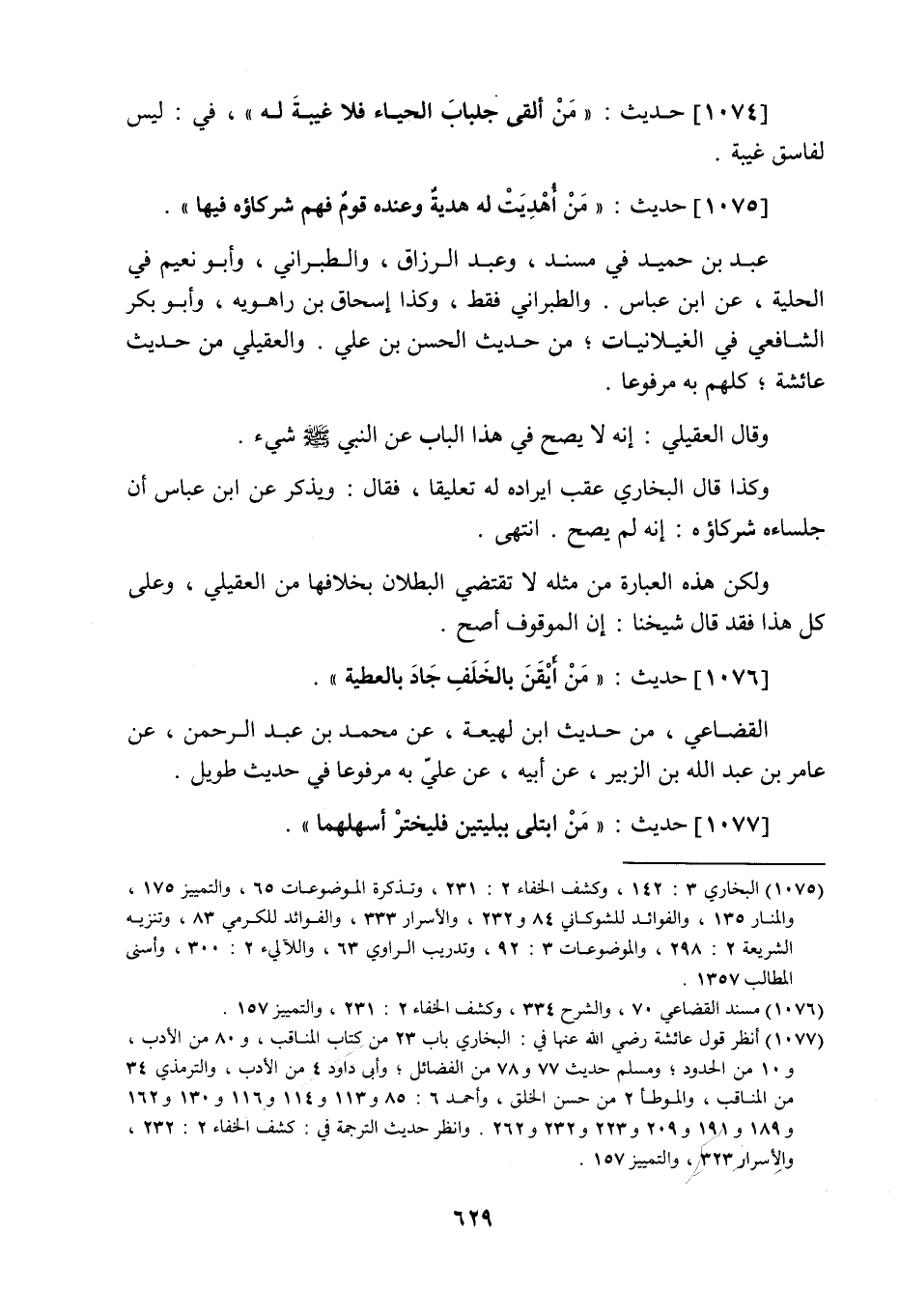 1075 - حَدِيث: مَنْ أُهْدِيَتْ لَهُ هَدِيَّةٌ وَعِنْدَهُ قَوْمٌ فَهُمْ شُرَكَاؤُهُ فِيهَا؛ عبد بن حميد في مسنده وعبد الرزاق والطبراني وأبو نُعيم في الحلية عن ابن عباس، وللطبراني فقط وكذا إسحق ابن زاهويه وأبو بكر الشافعي في الغيلانيات من حديث الحسن بن علي والعقيلي من حديث عائشة كلهم به مرفوعا، وقال العقيلي إنه لا يصح في هذا الباب عن النبي صَلَّى اللَّهُ عَلَيْهِ وَسَلَّمَ شيء، وكذا قال البخاري عقب إيراده له تعليقا، فقال ويذكر عن ابن عباس أن جلساءه شركاؤه: أنه لم يصح انتهى، ولكن هذه العبارة من مثله لا تقتضي البطلان بخلافها من العقيلي وعلى كل هذا فقد قال شيخنا إن الموقوف أصح.