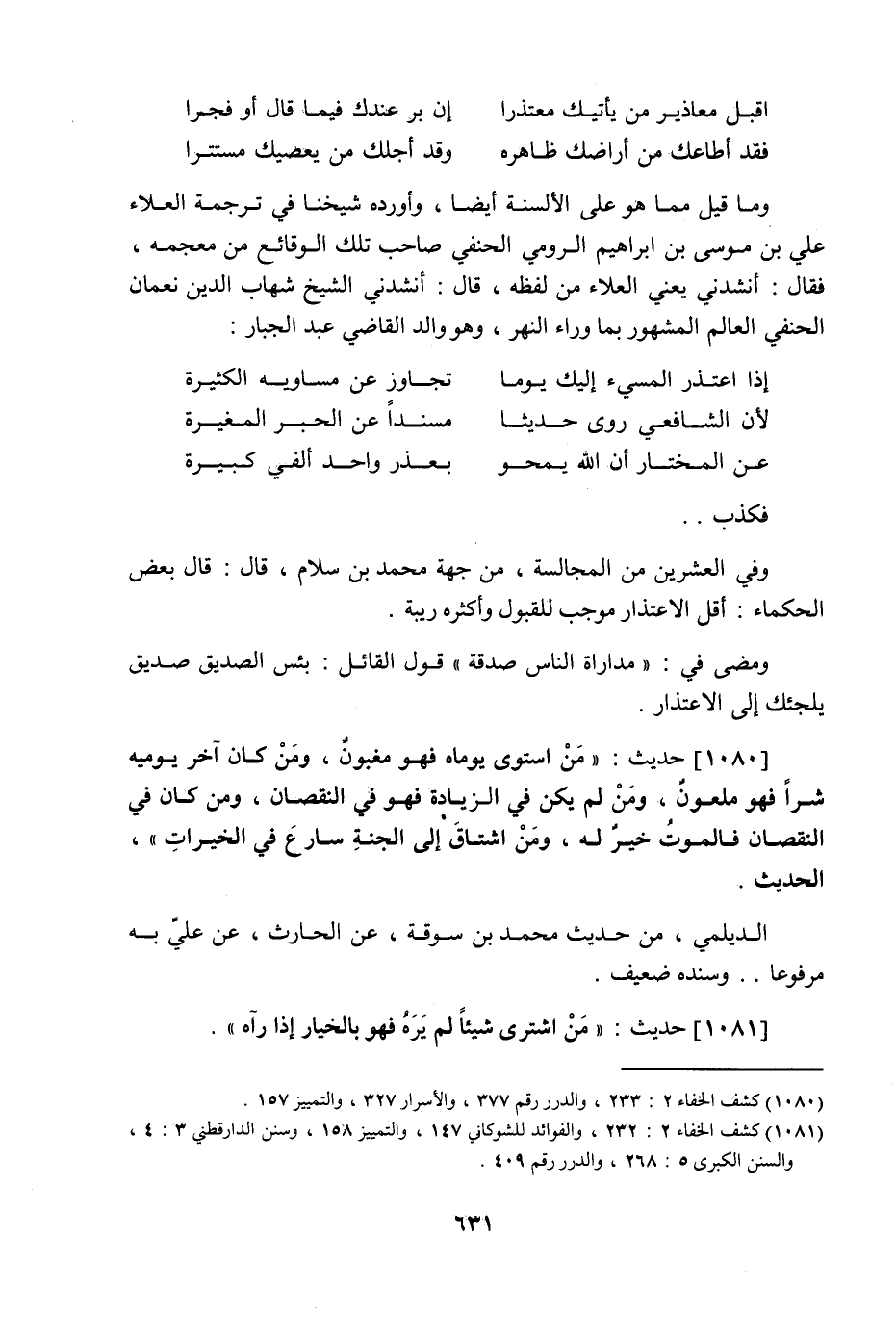 وما قيل مما هو على الألسنة أيضا، وأورده شيخنا في ترجمة العلاء علي بن موسى بن إبراهيم الرومي الحنفي صاحب تلك الوقائع من معجمه فقال: أنشدني يعني العلاء من لفظه قال: أنشدني الشيخ شهاب الدين نعمان الحنفي العالم المشهور بما وراء النهر وهو والد القاضي عبد الجبار: