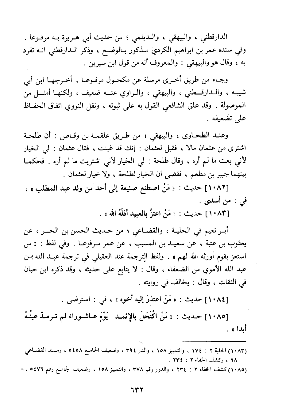 1083 - حَدِيث: مَنِ اعْتَزَّ بِالْعَبِيدِ أَذَلَّهُ اللَّه، أبو نُعيم في الحلية، والقضاعي، من حديث الحسن بن الحر عن يعقوب بن عتبة عن سعيد بن المسيب عن عمر مرفوعا، وفي لفظ: من استعز بقوم أورثه اللَّه لهم، ولفظ الترجمة عند العقيلي في ترجمة عبد اللَّه بن عبد اللَّه الأموي من الضعفاء، وقال: لا يتابع على حديثه، وقد ذكره ابن حبان في الثقات، وقال: يخالف في روايته.