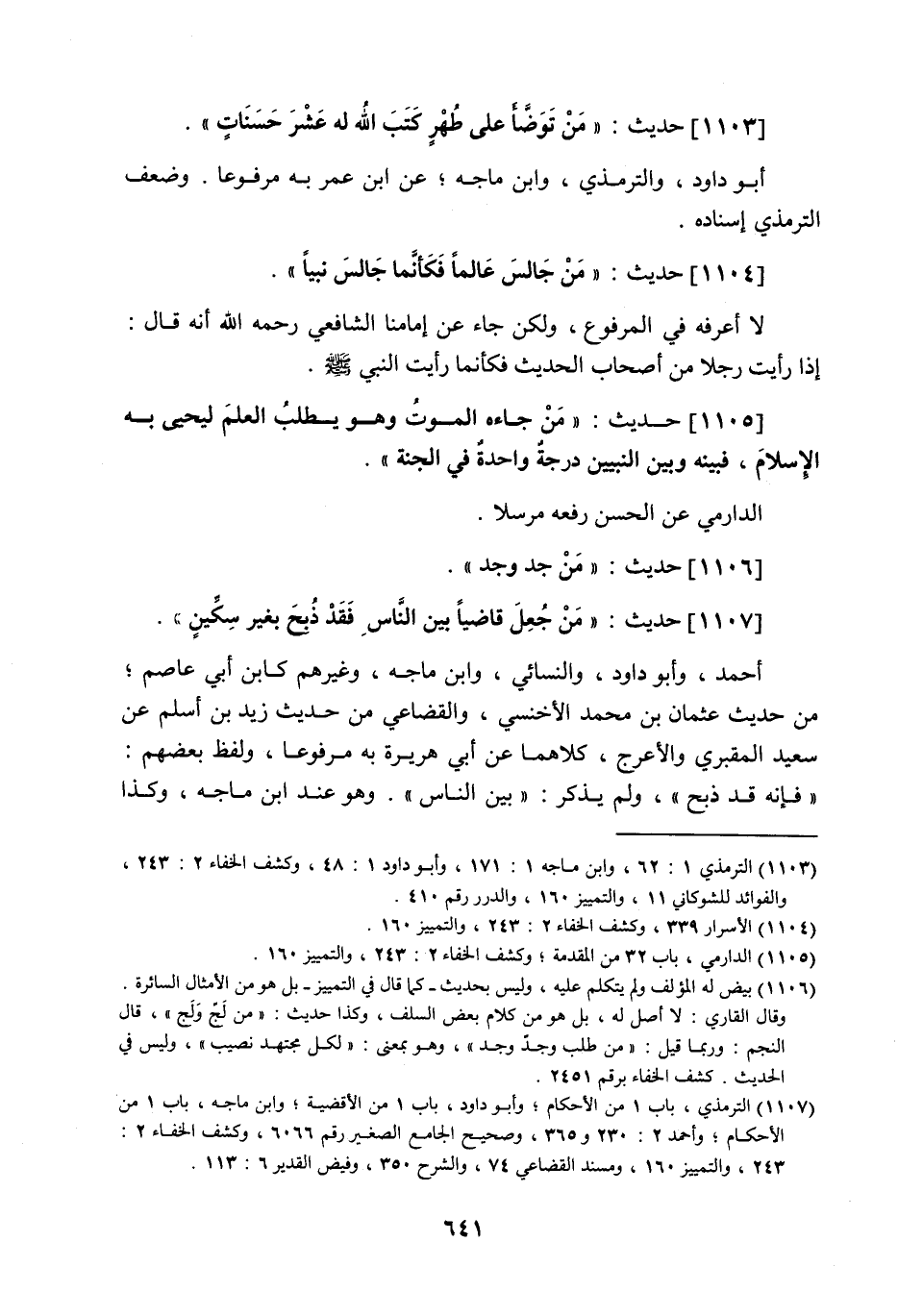 1107 - حَدِيث: مَنْ جُعِلَ قَاضِيًا بَيْنَ النَّاسِ فَقَدْ ذُبِحَ بِغَيْرِ سِكِّينٍ، أحمد وأبو داود والنسائي وابن ماجه وغيرهم، كابن أبي عاصم من حديث عثمان بن محمد الأخنسي، والقضاعي من حديث زيد بن أسلم عن سعيد المقبري والأعرج، كلاهما عن أبي هريرة به مرفوعا، ولفظ بعضهم: فإنه قد ذبح، ولم يذكر: بين الناس، وهو عند ابن ماجه، وكذا