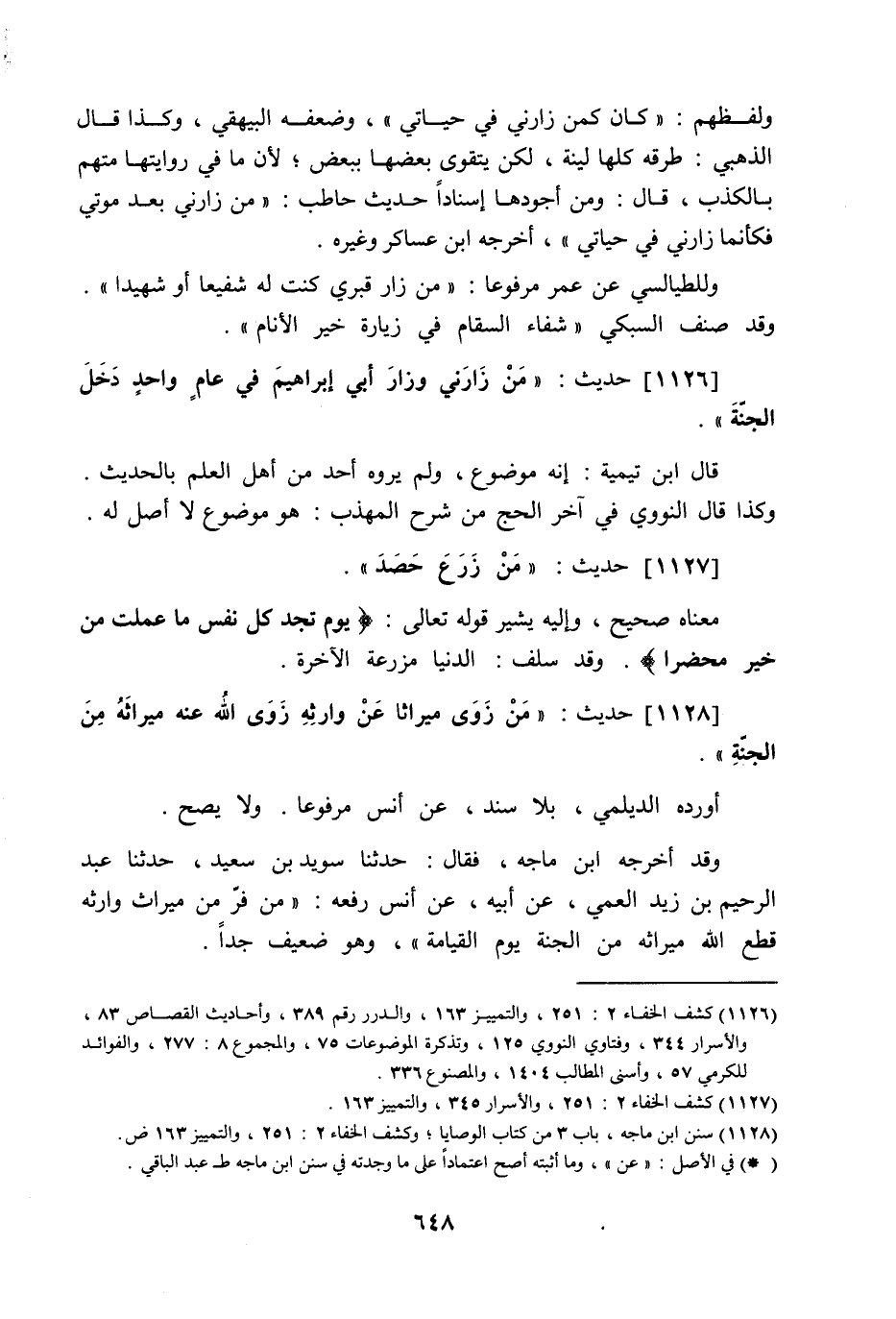 1126 - حَدِيث: مَنْ زَارَنِي وَزَارَ أَبِي إِبْرَاهِيمَ فِي عَامٍ وَاحِدٍ دَخَلَ الْجَنَّةَ، قال ابن تيمية: إنه موضوع، ولم يروه أحد من أهل العلم بالحديث، وكذا قال النووي في آخر الحج من شرح المهذب: هو موضوع، لا أصل له.