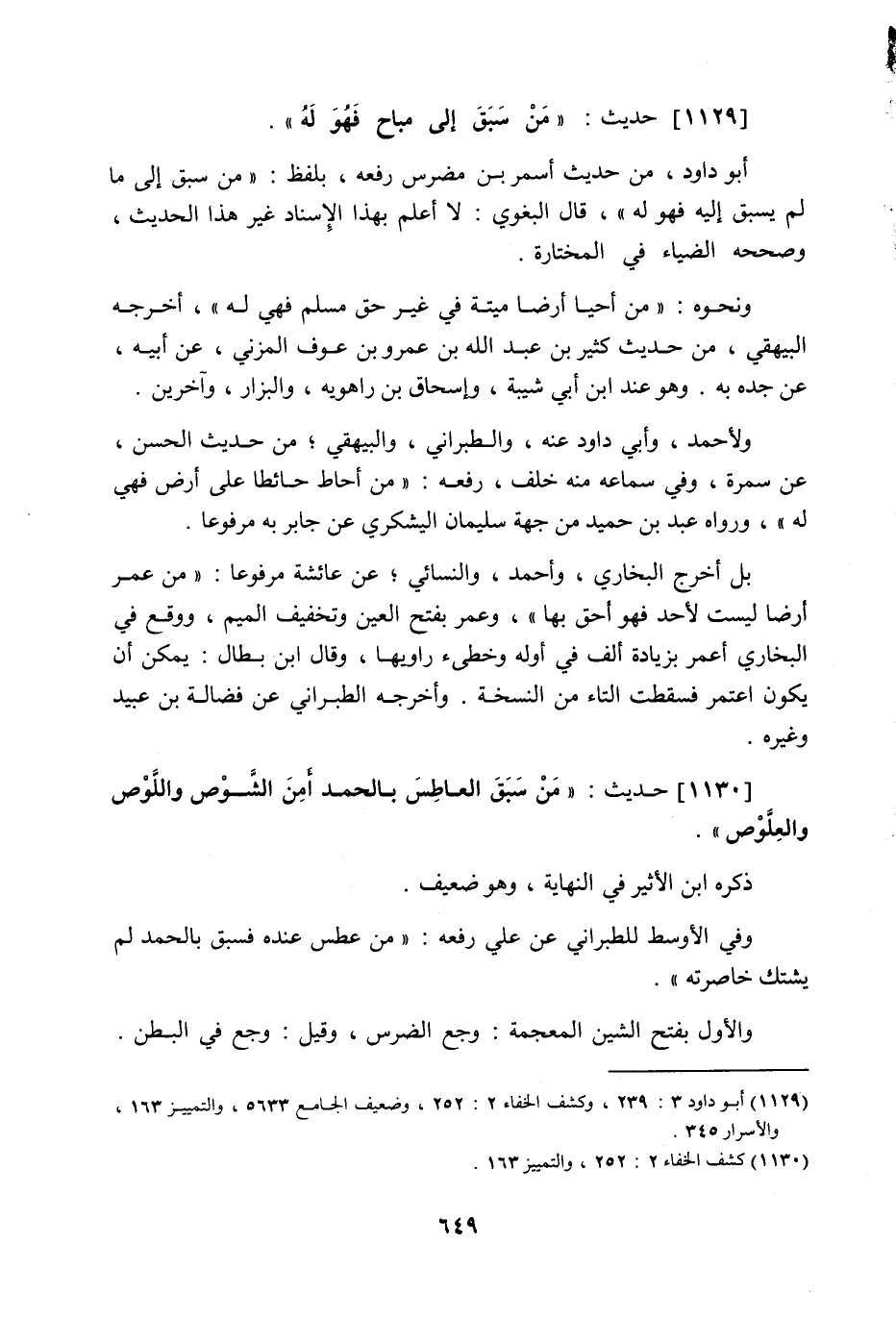 1129 - حَدِيث: مَنْ سَبَقَ إِلَى مُبَاحٍ فَهُوَ لَهُ، أبو داود من حديث أسمر ابن مضرس رفعه بلفظ: من سبق إلى ما لم يسبق إليه فهو له، قال البغوي: لا أعلم بهذا الإسناد غير هذا الحديث، وصححه الضياء في المختارة، ونحوه: من أحيا أرضا ميتة في غير حق مسلم فهي له، أخرجه البيهقي من حديث كثير بن عبد اللَّه بن عمرو بن عوف المزني عن أبيه عن جده به، وهو عند ابن أبي شيبة، وإسحاق بن راهويه، والبزار، وآخرين، ولأحمد أبي داود عنه، والطبراني، والبيهقي من حديث الحسن عن سمرة، وفي سماعه منه خلف، رفعه: من أحاط حائطا على أرض فهي له، ورواه عبد بن حميد من جهة سليمان البشكري عن جابر به مرفوعا، بل أخرج البخاري وأحمد والنسائي عن عائشة مرفوعا: من عمر أرضا ليست لأحد فهو أحق بها، وعمر بفتح العين وتخفيف الميم، ووقع في البخاري: أعمر بزيادة ألف في أوله، وخطئ راويها، وقال ابن بطال: يمكن أن يكون اعتمر، فسقطت التاء من النسخة، وأخرجه الطبراني عن فضالة بن عبيد وغيره.
