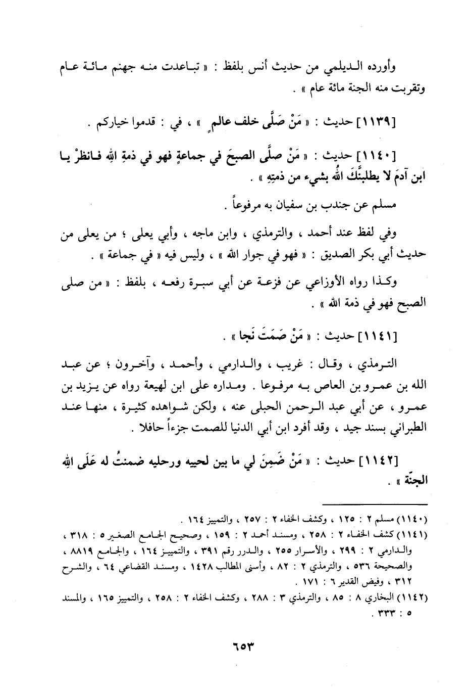 1140 - حَدِيث: مَنْ صَلَّى الصُّبْحَ فِي جَمَاعَةٍ فَهُوَ فِي ذِمَّةِ اللَّه، فَانْظُرْ يَا ابْنَ آدَمَ لا يُطْلُبَنَّكَ اللَّه بِشَيْءٍ مِنْ ذِمَّتِهِ، مسلم عن جندب بن سفيان به مرفوعا، وفي لفظ عند أحمد والترمذي وابن ماجه وأبي يعلى من يعلى من حديث أبي بكر الصديق: فهو في جوار اللَّه، وليس فيه: في جماعة، وكذا رواه الأوزاعي عن فزعة عن أبي سبرة رفعه بلفظ: من صلى الصبح فهو في ذمة اللَّه.