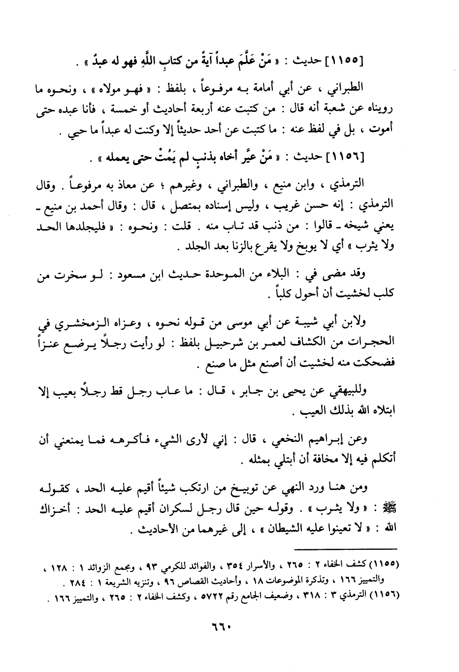 1156 - حَدِيث: مَنْ عَيَّرَ أَخَاهُ بِذَنْبٍ لَمْ يَمُتْ حَتَّى يَعْمَلَهُ، الترمذي وابن منيع والطبراني وغيرهم عن معاذ به مرفوعا، وقال الترمذي: إنه حسن غريب، وليس إسناده بمتصل، قال: وقال أحمد بن منيع يعني شيخه قالوا: من ذنب قد تاب منه، قلت: ونحوه فليجلدها الحد ولا يثرب، أي لا يوبخ ولا يقرع بالزنا بعد الجلد، وقد مضى في: البلاء من الموحدة حديث ابن مسعود: لو سخرت من كلب لخشيت أن أحول كلبا، ولابن أبي شيبة عن أبي موسى من قوله نحوه، وعزاه الزمخشري في الحجرات من الكشاف لعمر بن شرحبيل بلفظ: لو رأيت رجلا يرضع عنزا فضحكت منه لخشيت أن أصنع مثل ما صنع، وللبيهقي عن يحيى بن جابر قال: ما عاب رجل قط رجلا بعيب إلا ابتلاه اللَّه بذلك العيب، وعن إبراهيم النخعي قال: إني لأرى الشيء فأكرهه فما يمنعني أن أتكلم فيه إلا مخافة أن أبتلى بمثله، ومن هنا ورد النهي عن توبيخ من ارتكب شيئا أقيم عليه الحد كقوله صَلَّى اللَّهُ عَلَيْهِ وَسَلَّمَ: ولا يثرب. وقوله حين قال رجل لسكران أقيم عليه الحد أخزاك اللَّه: لا تعينوا عليه الشيطان إلى غيرهما من الأحاديث.