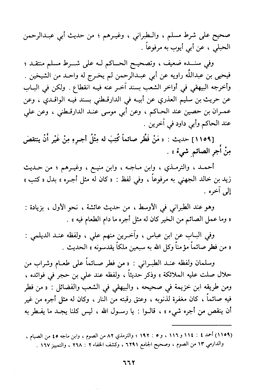 1159 - حَدِيث: مَنْ فَطَّرَ صَائِمًا كُتِبَ لَهُ مِثْلُ أَجْرِهِ مِنْ غَيْرِ أَنْ يَنْتَقِصَ مِنْ أَجْرِ الصَّائِمِ شَيْءٌ، أحمد والترمذي وابن ماجه وابن منيع وغيرهم من حديث زيد بن خالد الجهني به مرفوعا، وفي لفظ: كان له مثل أجره، بدل: كتب إلى آخره، وهو عند الطبراني في الأوسط من حديث عائشة نحو الأول بزيادة: وما عمل الصائم من الخير كان له مثل أجره ما دام الطعام فيه، وفي الباب عن ابن عباس وآخرين منهم علي ولفظه عند الديلمي: من فطر صائما مؤمنا وكل اللَّه به سبعين ملكا يقدسونه، الحديث. وسلمان ولفظه عند الطبراني: من فطر صائما على طعام وشراب من حلال صلت عليه الملائكة، وذكر حديثا، ولفظه عند علي بن حجر في فوائده، ومن طريقه ابن خزيمة في صحيحه، والبيهقي في الشعب والفضائل: من فطر فيه صائما كان مغفرة لذنوبه وعتق رقبته من النار، وكان له مثل أجره من غير أن ينقص من أجره شيء، قالوا: يا رسول اللَّه، ليس كلنا يجد ما يفطر به