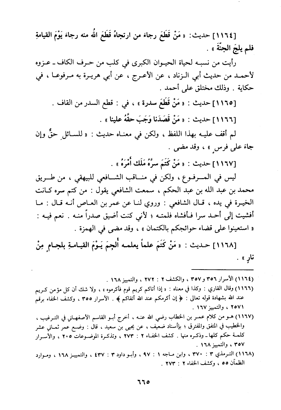 1167 - حَدِيث: مَنْ كَتَمَ سِرَّهُ مَلَكَ أَمْرَهُ، ليس في المرفوع (¬2) ، ولكن في مناقب الشافعي للبيهقي من طريق محمد بن عبد اللَّه بن عبد الحكم، سمعت الشافعي يقول: من كتم سره كانت الخيرة في يده، قال الشافعي: وروي لنا عن عمرو بن العاص أنه قال: ما أفشيت إلى أحد سرا فأفشاه فلمته، لأني كنت أضيق صدرا منه، نعم فيه: استعينوا على قضاء حوائجكم بالكتمان. وقد مضى في الهمزة.