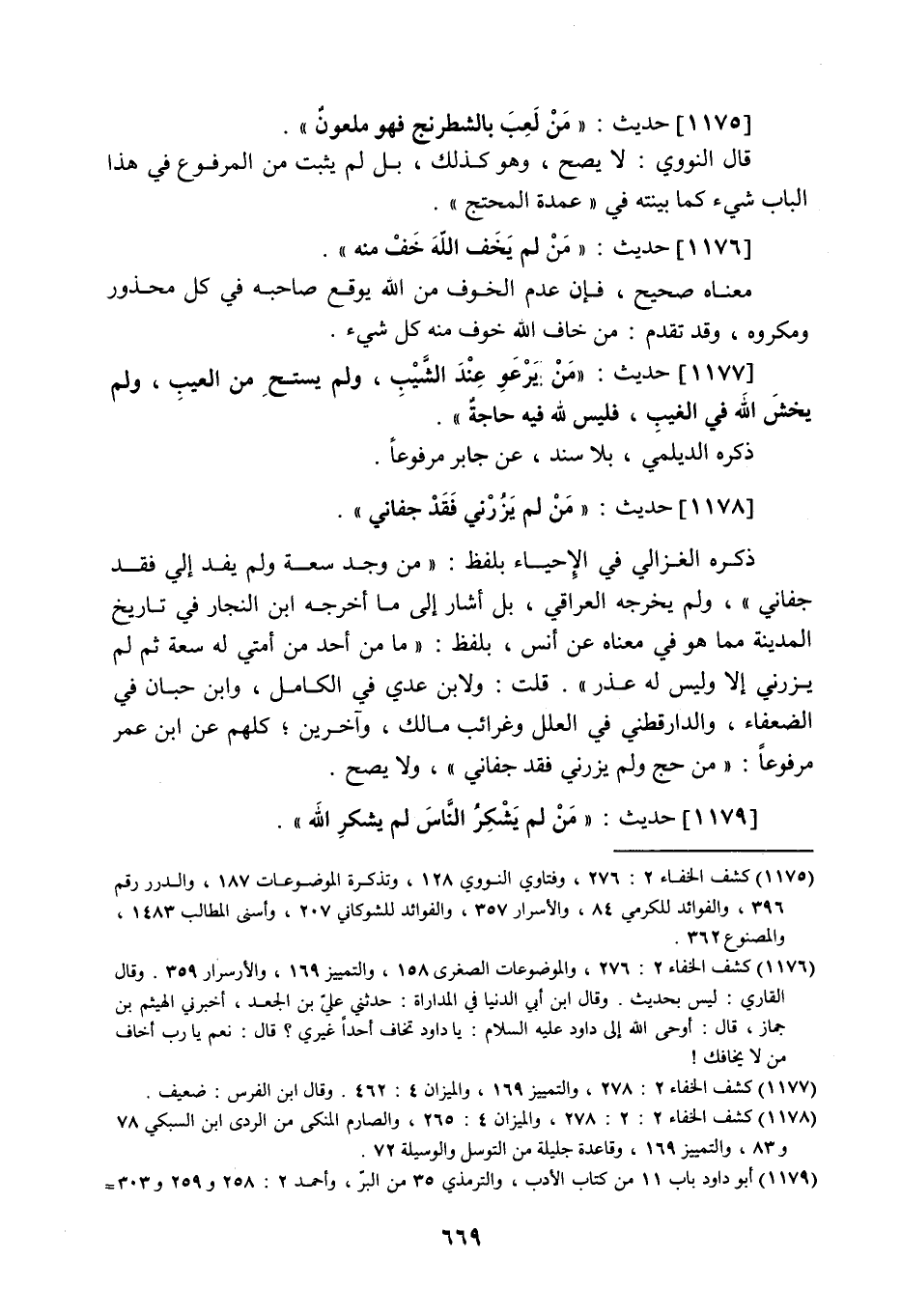 1178 - حَدِيث: مَنْ لَمْ يَزُرْنِي فَقَدْ جَفَانِي، ذكره الغزالي في الإحياء بلفظ: من وجد سعة ولم يفد إلي فقد جفاني، ولم يخرجه العراقي، بل أشار إلى ما أخرجه ابن النجار في تاريخ المدينة مما هو في معناه عن أنس بلفظ: ما من أحد من أمتي له سعة، ثم لم يزرني إلا وليس له عذر، قلت: ولابن عدي في الكامل، وابن حبان في الضعفاء، والدارقطني في العلل، وغرائب مالك، وآخرين، كلهم على ابن عمر مرفوعا: من حج ولم يزرني فقد جفاني، ولا يصح.