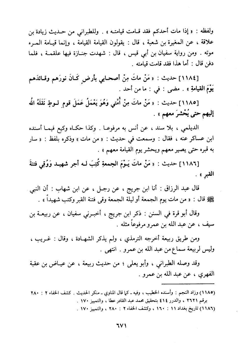 1184 - حَدِيث: مَنْ مَاتَ مِنْ أَصْحَابِي بِأَرْضٍ كَانَ نُورَهُمْ وَقَائِدَهُمْ يَوْمَ الْقِيَامَةِ، مضى في: ما من أحد.
