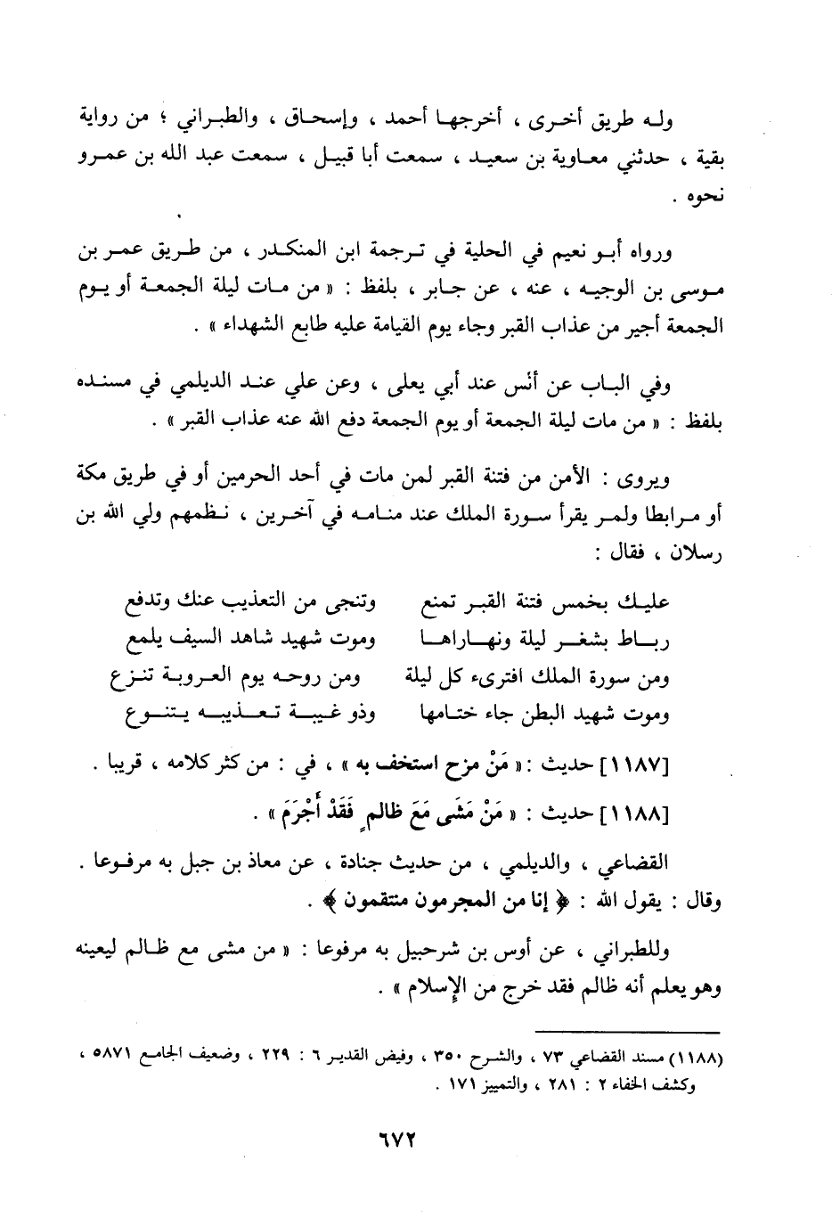 وله طريق أخرى أخرجها أحمد وإسحاق والطبراني من رواية بقية حدثني معاوية بن سعيد سمعت أبا قبيل سمعت عبد اللَّه بن عمرو نحوه، ورواه أبو نُعيم في الحلية في ترجمة ابن المنكدر، من طريق عمر بن موسى بن الوجيه عنه عن جابر بلفظ: من مات ليلة الجمعة أو يوم الجمعة أجير من عذاب القبر وجاء يوم القيامة عليه طابع الشهداء، وفي الباب عن أنس عند أبي يعلى، وعن علي عند الديلمي في مسنده بلفظ: من مات ليلة الجمعة أو يوم الجمعة دفع اللَّه عنه عذاب القبر، ويروى: الأمن من فتنة القبر لمن مات في أحد الحرمين، أو في طريق مكة، أو مرابطا، ولمن يقرأ سورة الملك عند منامه، في آخرين، نظمهم ولي اللَّه ابن رسلان فقال: