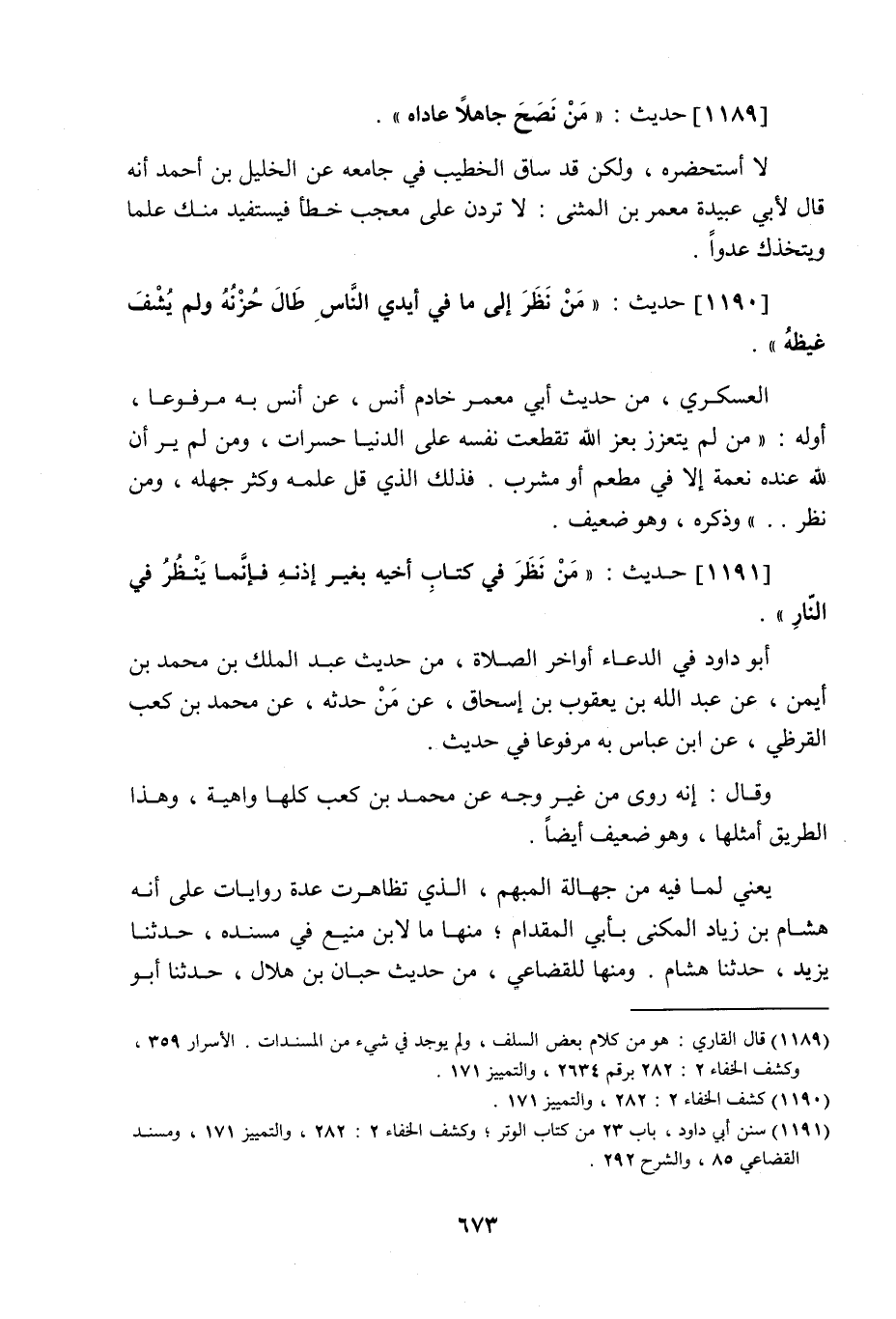 1189 - حَدِيث: مَنْ نَصَحَ جَاهِلا عَادَاهُ، لا أستحضره، ولكن قد ساق الخطيب في جامعه عن الخليل بن أحمد أنه قال لأبي عبيدة معمر بن المثنى: لا تردن على معجب خطأ فيستفيد منك علما ويتخذك عدوا.