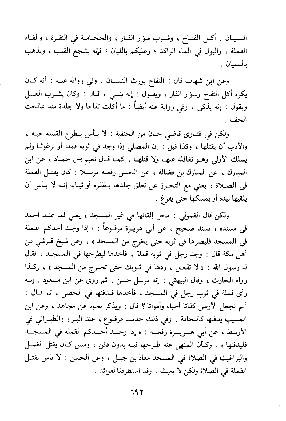 النسيان، أكل التفاح، وشرب سؤر الفار، والحجامة في النقرة، وإلقاء القملة، والبول في الماء الراكد، وعليكم باللبان فإنه يشجع القلب، ويذهب بالنسيان، وعن ابن شهاب قال: التفاح يورث النسيان، وفي رواية عنه أنه كان يكره أكل التفاح، وسؤر الفار، ويقول: إنه ينسي، قال: وكان يشرب العسل ويقول: إنه يذكي، وفي رواية عنه أيضا: ما أكلت تفاحا ولا جلدة منذ عالجت الحفظ، ولكن في فتاوى قاضي خان من الحنفية: لا بأس بطرح القملة حية، والأدب أن يقتلها، وكذا قيل: إن المصلي إذا وجد في ثوبه قملة أو برغوثا ولم يسلك الأولى وهو تغافله عنها ولا قتله كما قال نعيم بن حماد عن ابن المبارك عن المبارك بن فضالة عن الحسن رفعه مرسلا: كان يقتل القملة في الصلاة (¬1) ، يعني مع التحرز عن تعلق جلدها بظفره أو ثيابه: أنه لا بأس أن يلقيها بيده أو يمسكها حتى يفرغ، ولكن قال القمولي: محل إلقائها في غير المسجد، يعني لما عند أحمد في مسنده بسند صحيح عن أبي هريرة مرفوعا: إذا وجد أحدكم القملة في المسجد فليصرها في ثوبه حتى يخرج من المسجد، وعن شيخ قرشي من أهل مكة قال: وجد رجل في ثوبه قملة فأخذها ليطرحها في المسجد فقال له رسول اللَّه صلى الله عليه وآله وسلم: لا تفعل ردها في ثوبك حتى تخرج من المسجد، وكذا رواه الحارث، وقال البيهقي: إنه مرسل حسن، ثم روى عن ابن مسعود أنه رأى قملة في ثوب رجل في المسجد، فأخذها فدفنها في الحصى، ثم قال: ألم نجعل الأرض كفاتا أحياء وأمواتا، قال: ويذكر نحوه عن مجاهد، وعن ابن المسيب يدفنها كالنخامة، وفي ذلك حديث مرفوع عند البزار والطبراني في الأوسط عن أبي هريرة رفعه: إذا وجد أحدكم القملة في المسجد فليدفنها، وكأن المنهي عنه طرحها فيه بدون دفن، وممن كان يقتل القمل والبراغيث في الصلاة في المسجد معاذ بن جبل، وعن الحسن: لا بأس بقتل القملة في الصلاة ولكن لا يعبث، وقد استطردنا لفوائد.