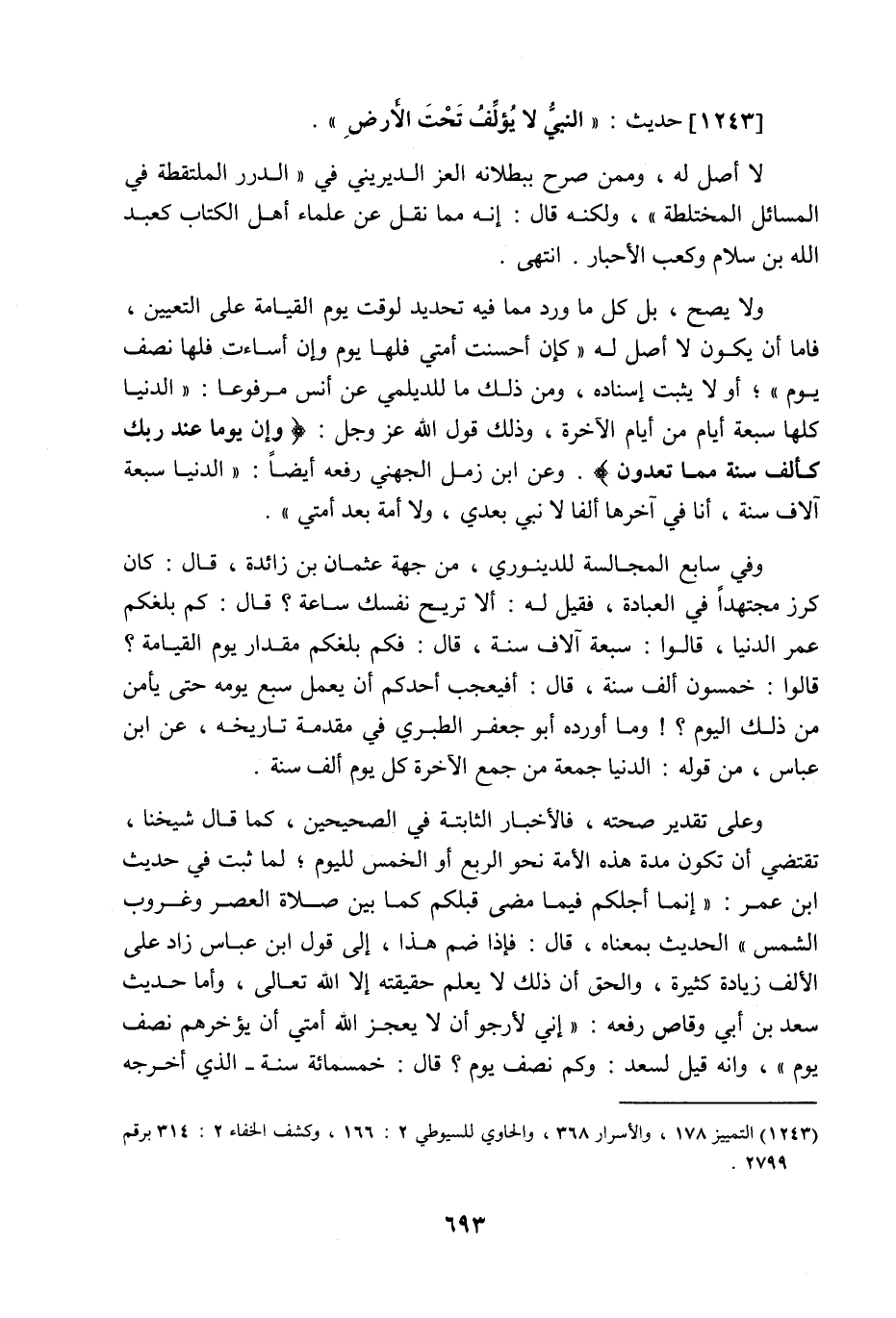 1243 - حديث: النَّبِيُّ لا يُؤَلِّفُ تَحْتَ الأَرْضِ، لا أصل له وممن صرح ببطلانه العز الديريني في الدرر الملتقطة في المسائل المختلطة ولكنه قال إنه مما نقل عن علماء أهل الكتاب كعبد اللَّه بن سلام وكعب الأحبار انتهى، ولا يصح بل كل ما ورد مما فيه تحديد لوقت يوم القيامة على التعيين فإما أن يكون لا أصل له، كإن أحسنت أمتي فلها يوم وإن أساءت فلها نصف يوم، أو لا يثبت إسناده ومن ذلك ما للديلمي عن أنس مرفوعا: الدنيا كلها سبعة أيام من أيام الآخرة وذلك قول اللَّه عز وجل " وَإِنَّ يَوْمًا عِنْدَ رَبِّكَ كَأَلْفِ سَنَةٍ مِمَّا تَعُدُّونَ " وعن ابن زمل الجهني رفعه أيضا: الدنيا سبعة آلاف سنة أنا في آخرها ألفا لا نبي بعدي ولا أمة بعد أمتي، وفي سابع المجالسة للدينوري من جهة عثمان بن زائدة قال كان كرز مجتهدا في العبادة فقيل له ألا تريح نفسك ساعة؟ قال: كم بلغكم عمر الدنيا، قالوا سبعة آلاف سنة قال فكم بلغكم مقدار يوم القيامة قالوا خمسون آلف سنة قال أفيعجب أحدكم أن يعمل سبع يومه حتى يأمن من ذلك اليوم، وما أورده أبو جعفر الطبري في مقدمة تاريخه عن ابن عباس من قوله الدنيا جمعة من جمع الآخرة كل يوم ألف سنة وعلى تقدير صحته فالأخبار الثابتة في الصحيحين كما قال شيخنا تقتضي أن تكون مدة هذه الأمة نحو الربع أو الخمس لليوم، لما ثبت في حديث ابن عمر: إنما أجلكم فيما مضى قبلكم كما بين صلاة العصر وغروب الشمس، الحديث بمعناه قال فإذا ضم هذا، إلى قول ابن عباس زاد على الألف زيادة كثيرة، والحق أن ذلك لا يعلم حقيقته إلا اللَّه تعالى، وأما حديث سعد بن أبي وقاص رفعه: إني لأرجو أن لا يعجز اللَّه أمتي أن يؤخرهم نصف يوم وإنه قيل لسعد وكم نصف يوم قال خمسمائة سنة، الذي أخرجه