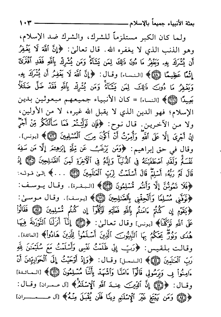 وَلما كَانَ الْكبر مستلزما للشرك والشرك ضد الْإِسْلَام وَهُوَ الذَّنب الَّذِي لَا يغفره الله قَالَ تَعَالَى [48 النِّسَاء] : {إِن الله لَا يغْفر أَن يُشْرك بِهِ وَيغْفر مَا دون ذَلِك لمن يَشَاء وَمن يُشْرك بِاللَّه فقد افترى إِثْمًا عَظِيما} وَقَالَ [116 النِّسَاء] : {إِن الله لَا يغْفر أَن يُشْرك بِهِ وَيغْفر مَا دون ذَلِك لمن يَشَاء وَمن يُشْرك بِاللَّه فقد ضل ضلالا بَعيدا} كَانَ الْأَنْبِيَاء جَمِيعهم مبعوثين بدين الْإِسْلَام فَهُوَ الدَّين الَّذِي لَا يقبل الله غَيره لَا من الْأَوَّلين وَلَا من الآخرين قَالَ نوح [72 يُونُس] : {فَإِن توليتم فَمَا سألتكم من أجر إِن أجري إِلَّا على الله وَأمرت أَن أكون من الْمُسلمين} وَقَالَ فِي حق إِبْرَاهِيم [130-132 الْبَقَرَة] : {وَمن يرغب عَن مِلَّة إِبْرَاهِيم إِلَّا من سفه نَفسه وَلَقَد اصطفيناه فِي الدُّنْيَا وَإنَّهُ فِي الْآخِرَة لمن الصَّالِحين * إِذْ قَالَ لَهُ ربه أسلم قَالَ أسلمت لرب الْعَالمين} إِلَى قَوْله: {فَلَا تموتن إِلَّا وَأَنْتُم مُسلمُونَ} وَقَالَ يُوسُف [101 يُوسُف] : {توفني مُسلما وألحقني بالصالحين} وَقَالَ مُوسَى [84-85 يُونُس] : {يَا قوم إِن كُنْتُم آمنتم بِاللَّه فَعَلَيهِ توكلوا إِن كُنْتُم مُسلمين * فَقَالُوا على الله توكلنا} وَقَالَ تَعَالَى [44 الْمَائِدَة] : {إِنَّا أنزلنَا التَّوْرَاة فِيهَا هدى وَنور يحكم بهَا النَّبِيُّونَ الَّذين أَسْلمُوا للَّذين هادوا} وَقَالَت بلقيس [44 النَّمْل] : {رب إِنِّي ظلمت نَفسِي وَأسْلمت مَعَ سُلَيْمَان لله رب الْعَالمين} وَقَالَ [111 الْمَائِدَة] : {وَإِذ أوحيت إِلَى الحواريين أَن آمنُوا بِي وبرسولي قَالُوا آمنا واشهد بأننا مُسلمُونَ} وَقَالَ [19 آل عمرَان] : {إِن الدَّين عِنْد الله الْإِسْلَام} وَقَالَ [85 آل عمرَان] : {وَمن يبتغ غير الْإِسْلَام دينا فَلَنْ يقبل مِنْهُ}