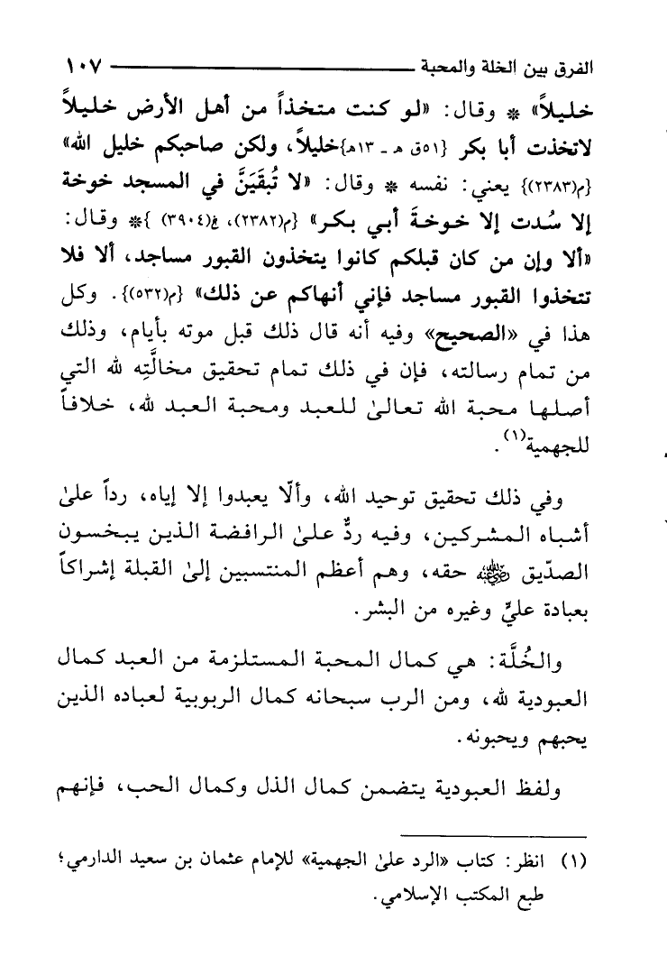 وَقَالَ: " لَا تبقين فِي الْمَسْجِد خوخة إِلَّا سدت إِلَّا خوخة أَبى بكر ". وَقَالَ: " أَلا وَإِن من كَانَ قبلكُمْ كَانُوا يتخذون الْقُبُور مَسَاجِد أَلا فَلَا تَتَّخِذُوا الْقُبُور مَسَاجِد إنى أنهاكم عَن ذَلِك ". وكل هَذَا فِي " الصَّحِيح " وَفِيه أَنه قَالَ ذَلِك قبل مَوته بأيام وَذَلِكَ من تَمام رسَالَته فَإِن فِي ذَلِك تَمام تَحْقِيق مخالته لله الَّتِي أَصْلهَا محبَّة الله تَعَالَى للْعَبد ومحبة العَبْد لله خلافًا للجهمية.