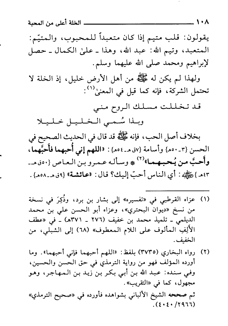 بِخِلَاف أصل الْحبّ فَإِنَّهُ صلى الله عَلَيْهِ وَسلم قد قَالَ فِي الحَدِيث الصَّحِيح فِي الْحسن وَأُسَامَة: " اللَّهُمَّ إنى أحبهما فأحبهما وَأحب من يحبهما ". وَسَأَلَهُ عَمْرو بن الْعَاصِ: أَي النَّاس أحب إِلَيْك؟ قَالَ: " عَائِشَة ".