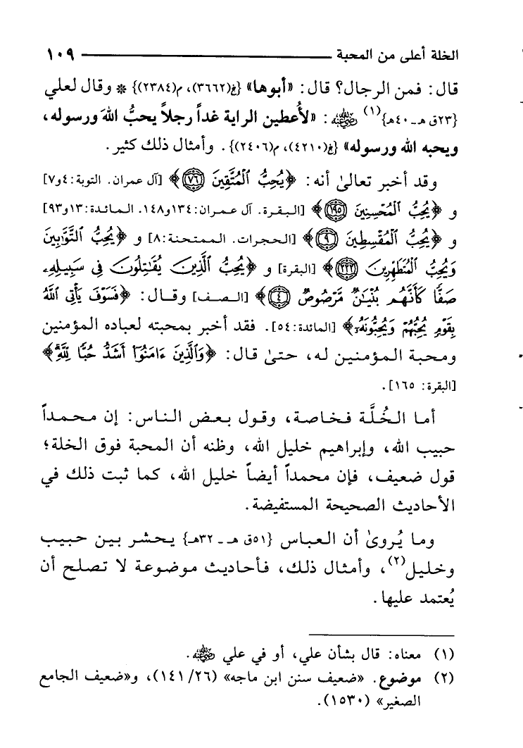 وَأما الْخلَّة فخاصة وَقَول بعض النَّاس: إِن مُحَمَّدًا حبيب الله وَإِبْرَاهِيم خَلِيل الله وظنه أَن الْمحبَّة فَوق الْخلَّة قَول ضَعِيف فَإِن مُحَمَّدًا أَيْضا خَلِيل الله كَمَا ثَبت ذَلِك فِي الْأَحَادِيث الصَّحِيحَة المستفيضة.