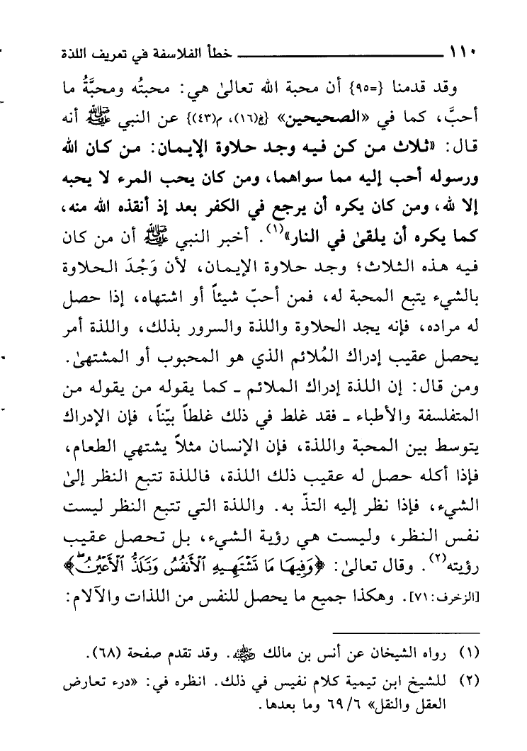 وَقد قدمنَا أَن محبَّة الله تَعَالَى هِيَ محبته ومحبة مَا أحب كَمَا فِي " الصَّحِيحَيْنِ " عَن النَّبِي صلى الله عَلَيْهِ وَسلم أَنه قَالَ: " ثَلَاث من كن فِيهِ وجد حلاوة الْإِيمَان: من كَانَ الله وَرَسُوله أحب إِلَيْهِ مِمَّا سواهُمَا وَمن كَانَ يحب الْمَرْء لَا يُحِبهُ إِلَّا لله وَمن كَانَ يكره أَن يرجع فِي الْكفْر بعد إِذْ أنقذه الله مِنْهُ كَمَا يكره أَن يلقى فِي النَّار ". أخبر النَّبِي صلى الله عَلَيْهِ وَسلم أَن من كَانَ فِيهِ هَذِه الثَّلَاث وجد حلاوة الْإِيمَان لِأَن وجد الْحَلَاوَة بالشَّيْء يتبع الْمحبَّة لَهُ فَمن أحب شَيْئا أَو اشتهاه إِذا حصل لَهُ مُرَاده فَإِنَّهُ يجد الْحَلَاوَة واللذة وَالسُّرُور بذلك واللذة أَمر يحصل عقيب إِدْرَاك الملائم الَّذِي هُوَ المحبوب أَو المشتهى. وَمن قَالَ: إِن اللَّذَّة إِدْرَاك الملائم - كَمَا يَقُوله من يَقُوله من المتفلسفة والأطباء - فقد غلط فِي ذَلِك غَلطا بَينا فَإِن الْإِدْرَاك يتوسط بَين الْمحبَّة واللذة فَإِن الْإِنْسَان مثلا يَشْتَهِي الطَّعَام فَإِذا أكله حصل لَهُ عقيب ذَلِك اللَّذَّة فاللذة تتبع النّظر إِلَى الشَّيْء فَإِذا نظر إِلَيْهِ التذ بِهِ واللذة الَّتِي تتبع النّظر لَيست نفس النّظر وَلَيْسَت هِيَ رُؤْيَة الشَّيْء بل تحصل عقيب رُؤْيَته وَقَالَ تَعَالَى [71 الزخرف] : {وفيهَا مَا تشتهيه الْأَنْفس وتلذ الْأَعْين} وَهَكَذَا جَمِيع مَا يحصل للنَّفس من اللَّذَّات والآلام