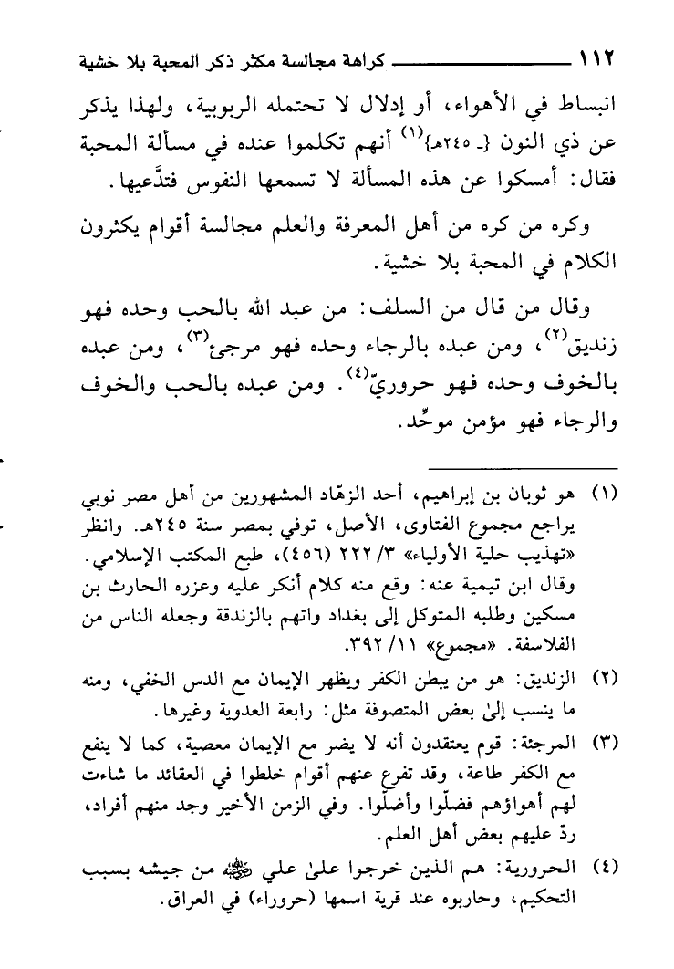 وَقَالَ من قَالَ من السّلف: من عبد الله بالحب وَحده فَهُوَ زنديق وَمن عَبده بالرجاء وَحده فَهُوَ مرجئ وَمن عَبده بالخوف وَحده فَهُوَ حروري وَمن عَبده بالحب وَالْخَوْف والرجاء فَهُوَ مُؤمن موحد.