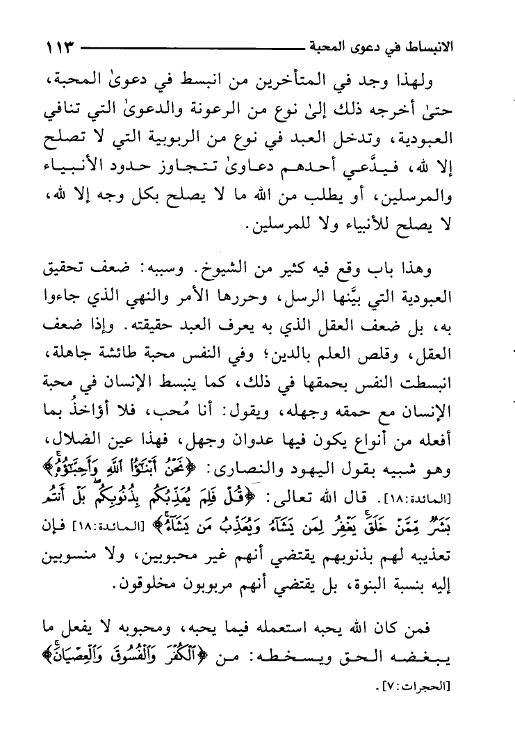وَلِهَذَا وجد فِي الْمُتَأَخِّرين من انبسط فِي دَعْوَى الْمحبَّة حَتَّى أخرجه ذَلِك إِلَى نوع من الرعونة وَالدَّعْوَى الَّتِي تنَافِي الْعُبُودِيَّة وَتدْخل العَبْد فِي نوع من الربوبية الَّتِي لَا تصلح إِلَّا لله فيدعي أحدهم دعاوى تتجاوز حُدُود الْأَنْبِيَاء وَالْمُرْسلِينَ أَو يطْلب من الله مَا لَا يصلح بِكُل وَجه إِلَّا لله لَا يصلح للأنبياء وَلَا للمرسلين.