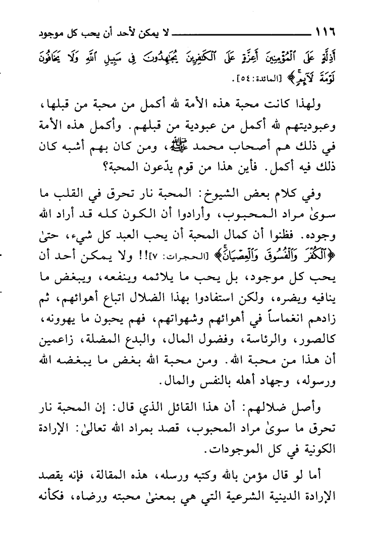 وَفِي كَلَام بعض الشُّيُوخ: الْمحبَّة نَار تحرق فِي الْقلب مَا سوى مُرَاد المحبوب. وَأَرَادُوا أَن الْكَوْن كُله قد أَرَادَ الله وجوده فظنوا أَن كَمَال الْمحبَّة أَن يحب العَبْد كل شَيْء حَتَّى الْكفْر والفسوق والعصيان وَلَا يُمكن لأحد أَن يحب كل مَوْجُود بل يحب مَا يلائمه وينفعه وَيبغض مَا يُنَافِيهِ ويضره وَلَكِن استفادوا بِهَذَا الضلال اتِّبَاع أهوائهم ثمَّ زادهم انغماسا فِي أهوائهم وشهواتهم فهم يحبونَ مَا يهوونه كالصور والرئاسة وفضول المَال والبدع المضلة زاعمين أَن هَذَا من محبَّة الله وَمن محبَّة الله بغض مَا يبغضه الله وَرَسُوله وَجِهَاد أَهله بِالنَّفسِ وَالْمَال.