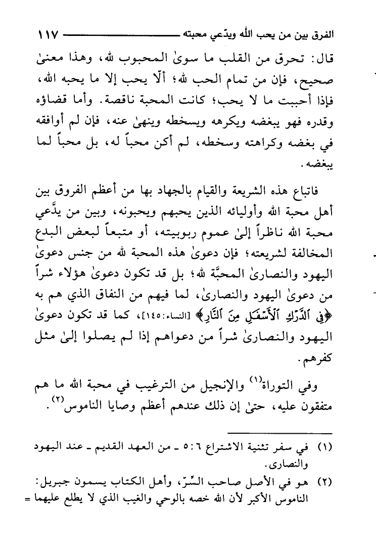 فاتباع هَذِه الشَّرِيعَة وَالْقِيَام بِالْجِهَادِ بهَا من أعظم الفروق بَين أهل محبَّة الله وأوليائه الَّذين يُحِبهُمْ وَيُحِبُّونَهُ وَبَين من يَدعِي محبَّة الله نَاظرا إِلَى عُمُوم ربوبيته أَو مُتبعا لبَعض الْبدع الْمُخَالفَة لشريعته فَإِن دَعْوَى هَذِه الْمحبَّة لله من جنس دَعْوَى الْيَهُود وَالنَّصَارَى الْمحبَّة لله بل قد تكون دَعْوَى هَؤُلَاءِ شرا من دَعْوَى الْيَهُود وَالنَّصَارَى لما فيهم من النِّفَاق الَّذين هم بِهِ فِي الدَّرك الْأَسْفَل من النَّار كَمَا قد تكون دَعْوَى الْيَهُود وَالنَّصَارَى شرا من دَعوَاهُم إِذا لم يصلوا إِلَى مثل كفرهم.
