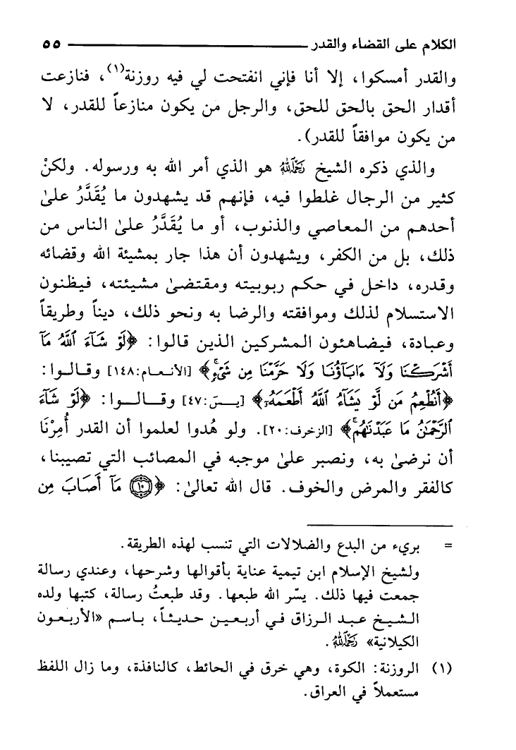 وَالَّذِي ذكره الشَّيْخ رَحمَه الله هُوَ الَّذِي أَمر الله بِهِ وَرَسُوله وَلَكِن كثير من الرِّجَال غلطوا فِيهِ فَإِنَّهُم قد يشْهدُونَ مَا يقدّر على أحدهم من الْمعاصِي والذنُوب أَو مَا يقدّر على النَّاس من ذَلِك بل من الْكفْر وَيشْهدُونَ أَن هَذَا جَار بِمَشِيئَة الله وقضائه وَقدره دَاخل فِي حكم ربوبيته وَمُقْتَضى مَشِيئَته فيظنون الاستسلام لذَلِك وموافقته وَالرِّضَا بِهِ وَنَحْو ذَلِك دينا وطريقا وَعبادَة فيضاهئون الْمُشْركين الَّذين قَالُوا [148 الْأَنْعَام] : {لَو شَاءَ الله مَا أشركنا وَلَا آبَاؤُنَا وَلَا حرمنا من شَيْء} وَقَالُوا [47 يس] : {أنطعم من لَو يَشَاء الله أطْعمهُ} وَقَالُوا [20 الزخرف] : {لَو شَاءَ الرَّحْمَن مَا عبدناهم} وَلَو هُدوا لعلموا أَن الْقدر أُمرنا أَن نرضى بِهِ وَنَصْبِر على مُوجبه فِي المصائب الَّتِي تصيبنا كالفقر وَالْمَرَض وَالْخَوْف قَالَ الله تَعَالَى [11 التغابن] : {مَا أصَاب من