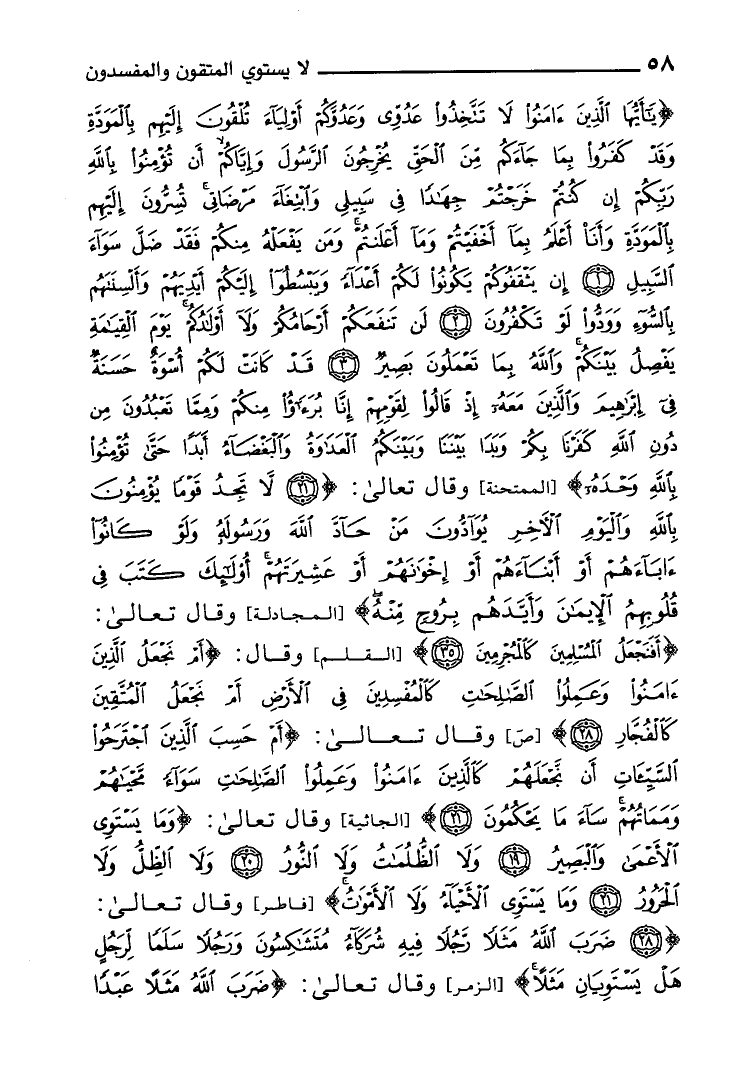 {يَا أَيُّهَا الَّذِينَ آمَنُوا لَا تَتَّخِذُوا عَدُوِّي وَعَدُوَّكُمْ أَوْلِيَاء تُلْقُونَ إِلَيْهِم بِالْمَوَدَّةِ وَقَدْ كَفَرُوا بِمَا جَاءكُم مِّنَ الْحَقِّ يُخْرِجُونَ الرَّسُولَ وَإِيَّاكُمْ أَن تُؤْمِنُوا بِاللَّهِ رَبِّكُمْ إِن كُنتُمْ خَرَجْتُمْ جِهَاداً فِي سَبِيلِي وَابْتِغَاء مَرْضَاتِي تُسِرُّونَ إِلَيْهِم بِالْمَوَدَّةِ وَأَنَا أَعْلَمُ بِمَا أَخْفَيْتُمْ وَمَا أَعْلَنتُمْ وَمَن يَفْعَلْهُ مِنكُمْ فَقَدْ ضَلَّ سَوَاء السَّبِيلِ * إِن يَثْقَفُوكُمْ يَكُونُوا لَكُمْ أَعْدَاء وَيَبْسُطُوا إِلَيْكُمْ أَيْدِيَهُمْ وَأَلْسِنَتَهُم بِالسُّوءِ وَوَدُّوا لَوْ تَكْفُرُونَ * لَن تَنفَعَكُمْ أَرْحَامُكُمْ وَلَا أَوْلَادُكُمْ يَوْمَ الْقِيَامَةِ يَفْصِلُ بَيْنَكُمْ وَاللَّهُ بِمَا تَعْمَلُونَ بَصِيرٌ * قَدْ كَانَتْ لَكُمْ أُسْوَةٌ حَسَنَةٌ فِي إِبْرَاهِيمَ وَالَّذِينَ مَعَهُ إِذْ قَالُوا لِقَوْمِهِمْ إِنَّا بُرَاء مِنكُمْ وَمِمَّا تَعْبُدُونَ مِن دُونِ اللَّهِ كَفَرْنَا بِكُمْ وَبَدَا بَيْنَنَا وَبَيْنَكُمُ الْعَدَاوَةُ وَالْبَغْضَاء أَبَداً حَتَّى تُؤْمِنُوا بِاللَّهِ وَحْدَهُ} وَقَالَ تَعَالَى [22 المجادلة] : {لَا تَجِد قوما يُؤمنُونَ بِاللَّه وَالْيَوْم الآخر يوادون من حاد الله وَرَسُوله وَلَو كَانُوا آبَاءَهُم أَو أَبْنَاءَهُم أَو إخْوَانهمْ أَو عشيرتهم أُولَئِكَ كتب فِي قُلُوبهم الْإِيمَان وأيدهم بِروح مِنْهُ} وَقَالَ تَعَالَى [35 الْقَلَم] : {أفنجعل الْمُسلمين كالمجرمين} وَقَالَ [28 ص] : {أم نجْعَل الَّذين آمنُوا وَعمِلُوا الصَّالِحَات كالمفسدين فِي الأَرْض أم نجْعَل الْمُتَّقِينَ كالفجار} وَقَالَ تَعَالَى [21 الجاثية] : {أم حسب الَّذين اجترحوا السَّيِّئَات أَن نجعلهم كَالَّذِين آمنُوا وَعمِلُوا الصَّالِحَات سَوَاء محياهم ومماتهم سَاءَ مَا يحكمون} وَقَالَ تَعَالَى [19-22 فاطر] : {وَمَا يَسْتَوِي الْأَعْمَى والبصير * وَلَا الظُّلُمَات وَلَا النُّور * وَلَا الظل وَلَا الحرور * وَمَا يَسْتَوِي الْأَحْيَاء وَلَا الْأَمْوَات} وَقَالَ تَعَالَى [29 الزمر] : {ضرب الله مثلا رجلا فِيهِ شُرَكَاء متشاكسون ورجلا سلما لرجل هَل يستويان مثلا} وَقَالَ تَعَالَى [75-76 النَّحْل] {ضرب الله مثلا عبدا